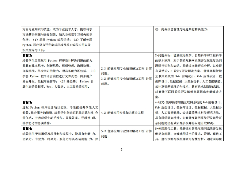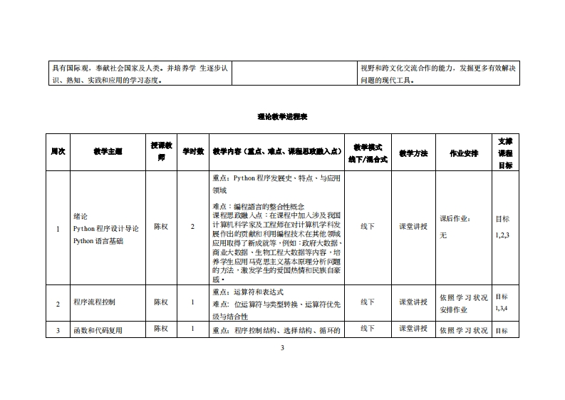 《程序设计》教学大纲课密名称:程序设计1课类别(必修选修),选修课程英文名称:Programming I总学时周学时学分:32/2/2其中实险实液学时,16先体课是:C语言程序设计后装裸程支撑:大数据基础授课时间:18周星期五7-8节,916周星期五56节授课地点:机房503提课对律:23智能制造1班43人·2班43人开课学陕:粤台产业科技学院任课慧姓名职称:陈权刷教报管鞭时间、地点与方式:课堂或课后,教室或通讯软件,当面或线上答凝课程考核方式:开港()闭卷()课程论文()其它()使用微村:Python编程从入门到实战-轻松过二级江红余青松清华大学出版社2021.2,·数村ISBN:978-7-302-57296-1·教学◆考资料:Python OpenCV从入门到精通者:明日科技清华大学出版社2021.9,ISBN:9787302583615课程简介:程序设计是高校计算机·电子信息·工商管理等相关专业的必修课程·Py0语言是一种解释型·面向对像的计算机程序设计语吉,广泛用于计算机程序设计数学语言·科学计算·数据分析·网路爬虫·人工智能·机器学习·大数据·W中开发·游戏开发·统管理编脚本语言等,特别话用于快速的应用程序开发·Python编程语言广受开发者的喜爱·已经成为最受欢迎的程序设计语言之一·本课程主要基于W所d0s和Py血om38构建Pon开发平台,过大量的实例·由浅人深·循序渐进地闸述Py血m语言的基础知识,以及使用Py血am语言的实际开发应用实例·日目标1:1-工程知识:能够运用数学、基础科学、计算机科1.3能够应用专业知识解块工程计算培养学生具备Python程序设计相关知识,使其能应学与技术、商务管理等相关知识,对于智能互联网问题。用于软件工程、人工智能信息工程、商务信息管理等系统开发运维所涉及的软件工程、人工智能信息工
