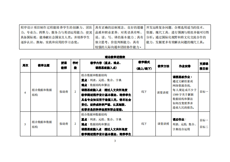 《程序设计Ⅱ》教学大纲课避名称:和序设计山课和类别必修选修:必修课程英文名称:ProgrammingⅡ总学时周学时学分:32/2/2其中实险实液学时:16先继课是:Programming I后续课程支撑:Py山on与大数据分析授课时间:4-19周■期三3,4授课地点:实验楼503课对津:2022鞭经激1,2班开裸学陕:粤合产业科妆学陕任课总柳姓名淋:张幼清刚越拉答振时间、地点与方式:课堂或裸后,放室或通讯状件,当面或线上答展课程考核方式:开卷0闭卷()课程论文0其它()使用微村:《Python一步到位I从基础编程到数据分析》,陈惠贞,中国水水电出版社,2020年11月,ISBN:9787517088752妆学事考资料:自编讲义课难槽介:Python提供了高效的高级数据结构,能简单有效地面向对象编程。Pym语法和动态类型,以及解释型语言的本质,使它成为多数平台上撰写脚本和快速开发应用的编程语言,随着版本的不断更新和语言新功能的添加,逐渐被用于独立的、大型项目的开发。Python解释器易于扩展,可以使用C语言或C+(或者其他可以通过C调用的语言)扩展新的功能和数据类型。Python也可用于可定制化软件中的扩展程序语言。Py丰富的标准库,提供了适用于各个主要系统平台的源码或机器码。程序设计的学习,不但可以罩握处理程序的描述工具和方法,为后续课程的学习创造条件,面且可以提高抽象思维和严格的逻辑推理能力,为将来参与创断性的研究和开发工作打下坚实的基础。1