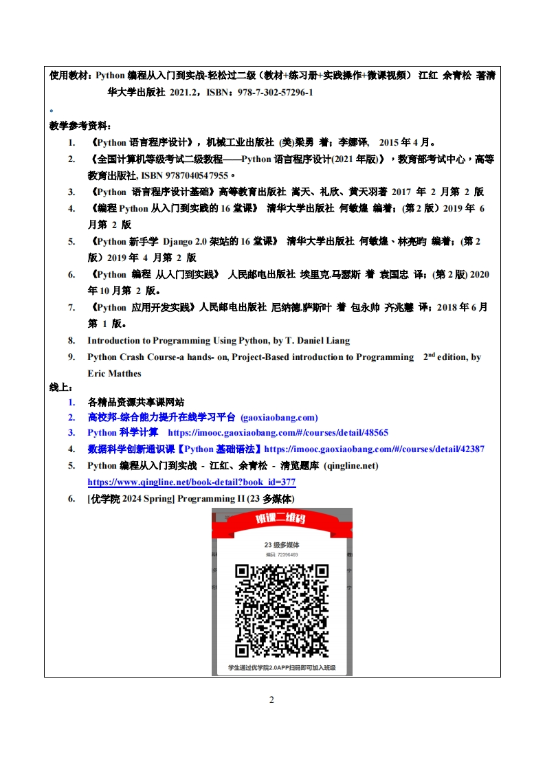 《程序设计Ⅱ〉教学大纲课程名称:程序设计Ⅱ课程类别(必修选修):必修课程英文名称:ProgrammingⅡ总学时/周学时学分:3222其中实验/实践学时:16先修课程:Programming I后续课程支撑:授课时间:周三1-2节授课地点:606机房授课对象:2023多煤体设计1班开课学院:粤台产业科技学院任课教师姓名职称:时维宁/副教授答疑时间、地点与方式:1每次课的课前、课间和课后,采用一对一的问答方式:2.每次习题课,采用集中讲解方式课程考核方式:开卷()闭卷(√)课程论文()其它(√)1