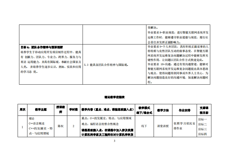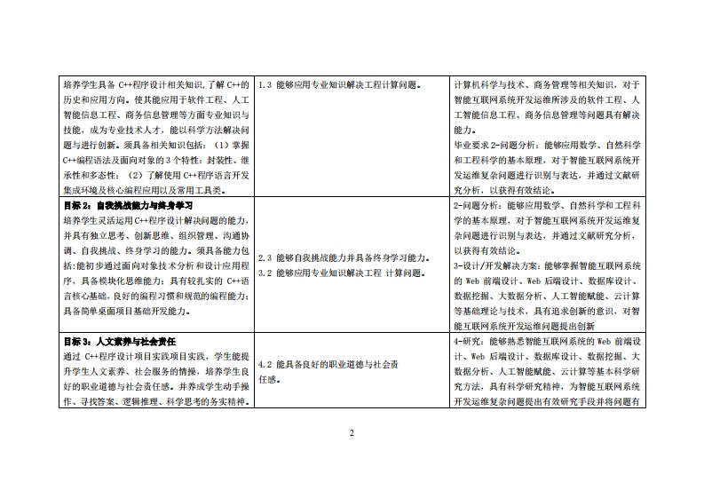 《程序设计Ⅱ》教学大纲课避名称,和序设计Ⅱ课和类别(必修选修)多必修课程英文名称:ProgrammingⅡ总学时周学时学分,32/2/2其中实险实减学时,16先修课是:Programmi恤gl后续课程支撑量据结构漫课时间:1-6周星期四34节)授课地点:实验楼503课对津:24电商1班32人,24电商2班31人开裸学瑰:粤合产业科妆学陕任课妆柳姓名淋:陈农测批线答鞭时间、地点与方式:课堂或裸后,放室或通讯状并,当面或战上密展课程考核方式:开卷()闭卷()课程论文()其它()作业·期末报告使用微村,(C+程序设计案例教程(线上线下混合版)),杨卫明,清华大学出版社·2023,教材SBN:9787302642657妆学考资料:无课程物介:《C/C+程序设计》课程是计算机类各专业一门最重要的专业基础课程。本课程主要内容有C+入门、基本数据类型与表达式、程序控制结构、数组、函数、指针与引用、结构体与共同体、类与对像、静态与友元、维承与多态、模板与标准模板库、输入输出流与文件等。通过该课程的学习,使学生掌握C+语言的基本内容,程序设计基础知识,面向过程和面向对象编程思想和理论,培养学生熟练运用C++语言解决实际问题的能力,为以后学习数据结构、算法设计与分析、C+程序设计等专业课程的打下坚实的基础。课程兹学目标及对毕业要求洲标点的支排课避被学目标支排毕业买求湘标点单业要求目标1:专业基础知识与创新能力毕业要求1-工程知识:能够运用数学、基础科学、