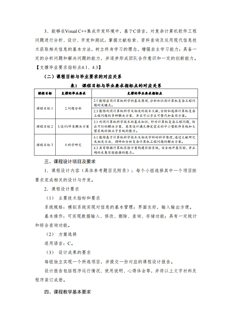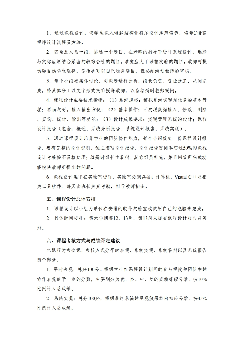 《程序设计基础课程设计》课程教学大纲一、课程信息课程名称:程序设计基础课程设计Course Design for Fundamentals of Programming课程代码:06E4103D课程类别:集中实践教学/必修课适用专业:计算机科学与技术专业课程学时:2周课程学分:1学分修读学期:第3学期先修课程:计算机导论、程序设计基础、程序设计基础实验二、课程目标《程序设计基础课程设计》作为一个独立的教学环节,是计算机科学与技术专业本科生集中实践教学环节系列之一,是学习《计算机导论》和《程序设计基础》课程后,结合专业能力培养需求而开设的一门综合性课程。通过本课程设计的完成,加深对结构化程序设计思想的深入理解。(一)具体目标通过本课程的学习,使学生达到以下目标:1、掌握C语言的结构体类型、指针和文件等应用:掌握数据定义、存储、管理、输入及输出功能所需具备的知识;掌握结构化程序设计的思想和方法;掌握程序设计基本流程;能够熟练运用结构化程序设计方法设计、编写、调试和运行C程序,从而逐步掌握科学的学习方法,具备一定的分析问题和解决问题的能力。【支撑毕业要求指标点2.1、2.3】2、能够应用面向过程思想及结构化程序设计的方法,并结合实际问题,对复杂计算机软件工程中的关键问题分析、建立相应的解决方案,给出方案的详细设计,设计相应关镀算法,并能使用数学建模和面向过程方法进行描述和解决。【支撑毕业要求指标点3.1】