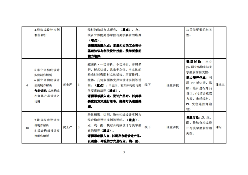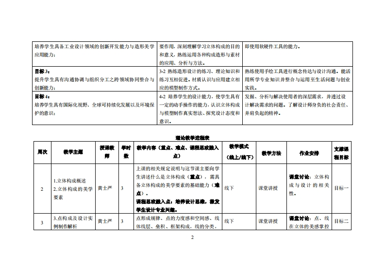 《立体构成与棋型制作》教学大纲课应名称,立体构成与横型制作课和类别(必修选修):必修课程英文名称:Three-Dimensional Constr四ction and Model Making总学时周学时学分,48W3/3其中实检实液学时,15先修课塞:后续课程支嫌授课时间:周二57节2-17周授课地点:实218提课对津:2020饺工业设计开裸学洗:粤合产业科妆学陕任课越柳姓名淋:黄士严越线答展时间、地点与方式:课避考核方式:开卷()闭卷()课程论文()其它()使用微村《立体构成设计散液》,王树上学着》,人民邮电出版社第一版,2011年12月ISBN:78-7-1152-6546-3妆学事考资料:《位体构成》,巩尊魂,李装,曹相东着,中国臣工出版社,2018年2月课难物介:通过本课容的举习使举生能靠立体构成的盖本理及要家,明导苹生过实标的操作体验、材料的性能和工艺特性,用造形设计的各种表现手法有意识地去组织和创造,从中增养学生设计的思德方式和能力。使好的迪形能力与类感为本专业的学习打下整实的基随。课程数学目标及对单业要求指标点的支排课妆学目标(以《化学反应工灌)为例支撑单业要求指标点单业要求目标1:1】立体构成的学习了解和罩握立体熟练运用设计基础知识,机械造知识与美学知培养具有工业设计与产品设计知识技能的专业设计人才:构成的相关的理论知识。识的能力。执行工业设计流程的专业能力。目标2422认识立体构成在产品设计中的重掌握扎实的工业设计基础知识与相关设计技能,以