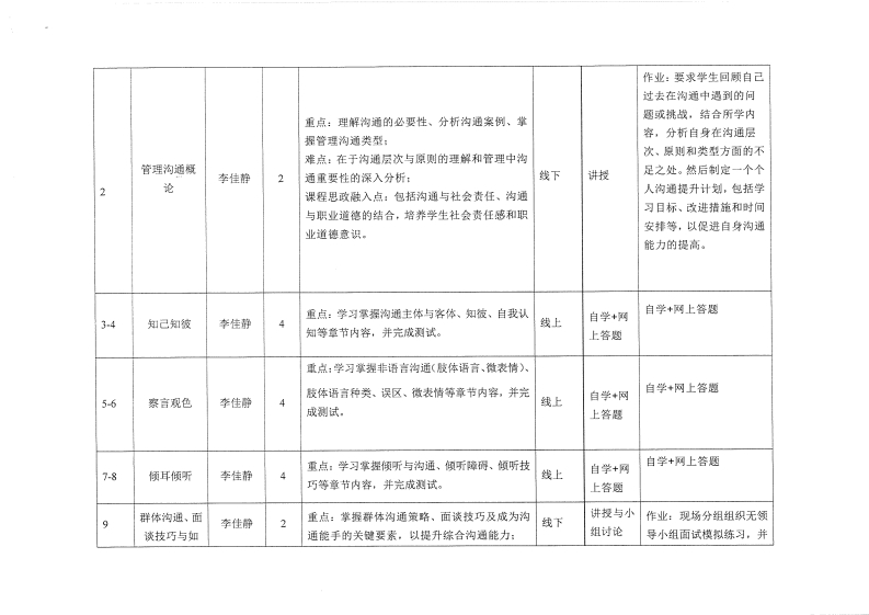 《管理沟通》教学大纲深程名称:管避沟通课程所属棋块:协作领导力深程英文名称:Management Communication总学时/周学时/学分:3222其中实验/实践学时:2先修课程:无授课时间:(未排课可不填)投课地点:(未排课可不填)授课对象:全日制本科二至四年级所有专业开课学院:琴台产业科技学院任课教师姓名/职称:李鱼静(讲师)答疑时间、地点与方式:课程考核方式:开卷()闭卷()课程论文()其它(√)使用教材:《管理沟通(第3版)》:杜荔群、朱仁宏著,清华大学出版社出版。教学参考资料:无课程简介:《管理沟通》课程旨在帮助学生深入理解沟通的多维内涵,掌握有效的沟通技巧,以提开其职业素质和就业竞争力。课程将引导学生从日常生活的实际情境出发,识别并克服沟通中的障碍与误区,通过采用案例分析、角色扮演等互动教学方法,使学生能够在实际情境中灵活运用所学沟通技能,从而在职场中实现更高效的交流与协作。课程教学目标:本课程与学生核心能力培养之间的关联一、知识目标:(打钩):1.理解管理沟通的基本理念及其在组织管理中的重要性:模块1:道德彰响力口模块2:审美鉴赏力口2掌握沟通的多种元素,包括观察、顿听、写作、语言表达和沉默等,并了解其在沟通模块3:协作领导力☑中的作用与影响:模块4:认知理解力口3熟悉管理沟通的滑见障碍与误区,以及如何通过案例分析识别和解决这些问题,祺块5:应用行动力口