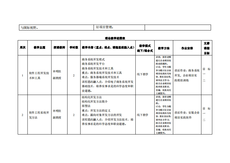 《系统分析与设计》教学大纲裸程名称:系统分析与设计课程类别(必修选修)事选修课程英文名称:System Analysis and Design总学时/周学时/学分,32/2/2其中实险实戒学时:16先能课是:JAVA语言应用开发后续课程支撑:敏据挖圳与业据仓库授课时间:1至16周里期一56节提课地点:机电校401提课对津:2023计算机科学与技术時境电商)电商1-2班粤开课学洗:粤台产业科技学陕任课敏即姓名/职淋:林明灶/测做授容疑时间、地点与方式:1每次课前和课后,实验楼307,采用一对一的问答方式:2每次习题课,采用集中讲解方式。课是考核方式:开卷()闭卷()课程论文()其它(√)使用微材:《信息系统分析与设计》,杜娟、赵春艳、王洪英、屈春艳、赵品品,第3阪ISBN9787302576433,清华大学出版社。敏学◆考资料:1.《大话软件工程一需求分析与软件设计》,李湾君,第1版,ISBN9787302544425,清华大学出版社.2.各精品资源共享课网站.课程情介:本课程系统介绍在软件工程中从事软件分析与设计业务和应用,软件设计工程化的模式,支持进行定性、定量的软件项目管理,业务分析与设计的理论、需求工程的调研与分析方法、业务的分析与设计方法、应用设计方法、业务用例和应用用例的编写方法、需求和设计的配套模板、规格书标准等.在结构上分为4个部分:1.基础部分,主要介绍电子商务系统的基本概念、常用开发方法及开发工具: