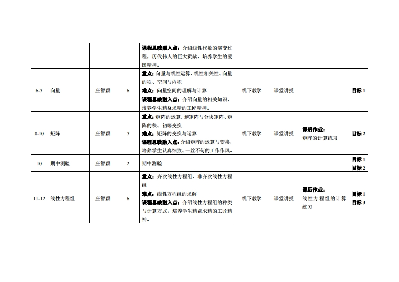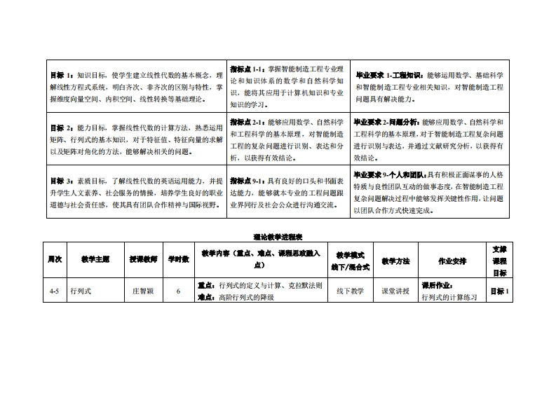 《线性代数》教学大纲裸课名称:线性代数课和类别(必修选修),必修课程英文名称:LinearAlgebra总学时周学时学分,40102.5其中实险实液学时,0先继课是:高等数学(A)1后续课程支撑自动控制原理、机械原理、工业机器人技术基础漫课时间:415周星期五57节、1617周星期五56节授课地点:6405课对律:2022智能制造2班、2022金融科技1班开裸学洗:粤台产业科技学院任课放甲姓名林:庄智领/副教授答展时间、地点与方式:1每次课的课前、课间和课后,采用一对一的问答方式:2每次习题课,采用集中讲解方式。课狸考核方式:开卷()闭港(√)课程论文()其它()使用微材:《线性代数》,太原理工大学数学学院主编,科学出版社,ISBN:9787030564511.课避信介:本课程之教学目标在于清楚并简洁地介绍线性代数的主要观念。讲授的内容含括:线性方程式系统、矩阵、行列试、向量空间、内积空间、线性转换、特征值及特征值与特征向量。此外,课程中将搭配应用实例,协助学生更具体了解上述课题的几何及物理意义。课程放学目标及对毕业要求州标点的支排:裸程妆学目标支排毕业要求指标点单业要求