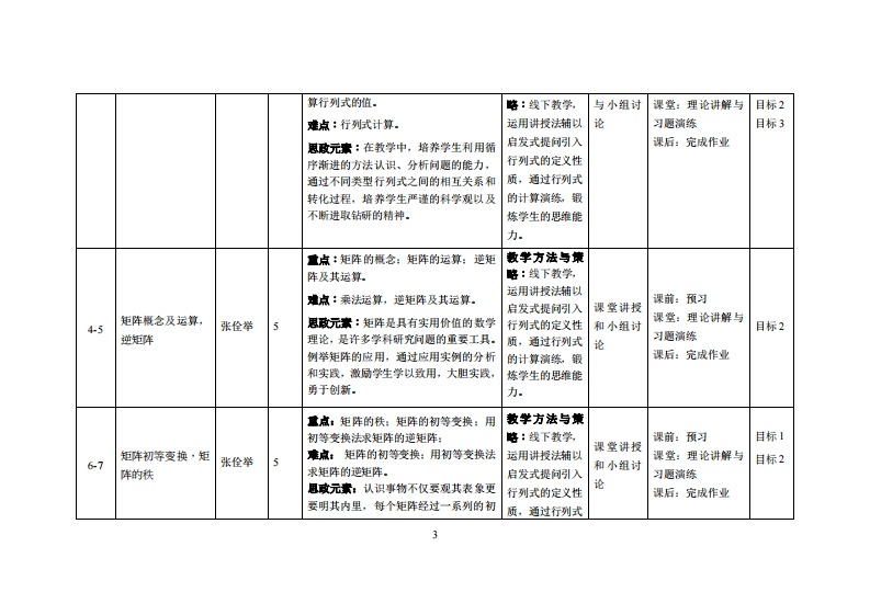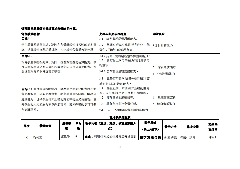 《线性代数》教学大纲课避名称,线性代数课和类别(必修选修)·必修课程文名称:LinearAlgebra总学时周学时学分,4032.5其中实检实减学时,0先修课是:初等代数后续课覆支撑运筹学,概幸论与数理统计,计量经济学,普通物理等授课时间:1-16周,每周四上午【13】节授课地点:提课对津:2021级电商开裸学桃:粤台科技产业学院任课微柳姓名淋:张伦举/教授鞭时间、地点与方式1课间减堂:2课后来动公室:3撒信等在线工具课程考恢方试:开卷()闭卷(/)课程论文()其它()使用微村《线性代数》第五版,赵树婚,国家级规划教材,中国人民大学出版社考妆村[1]周勇线性代数M,北京:北京大学出版社,2019年.2]刘金旺线性代数M北京:北京大学出版社,2019年.课程简介:《线性代数》是理工类各专业的一门重要的数学基础专业课程。本课程的主要内容是行列式的计算,矩阵运算,矩阵的初等变换,利用矩阵的初等变换求解方程组及逆矩阵,向量组的线性相关性,特征值与特征向量等有关基础知识和基本计算方法。随着计算机及其应用技术的飞速发展,很多重要领域都需要用到线性代数作为重要的计算和分析工具。因此,学习和掌握线性代数的理论和方法是掌握现代科学技术以及从事科学研究的重要基础和手段。通过本课程的学习,培养学生熟练掌握矩阵运算能力,从面为学生进一步学习后续课程和将来的工作实践莫定必要的数学基础。