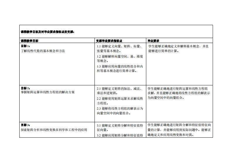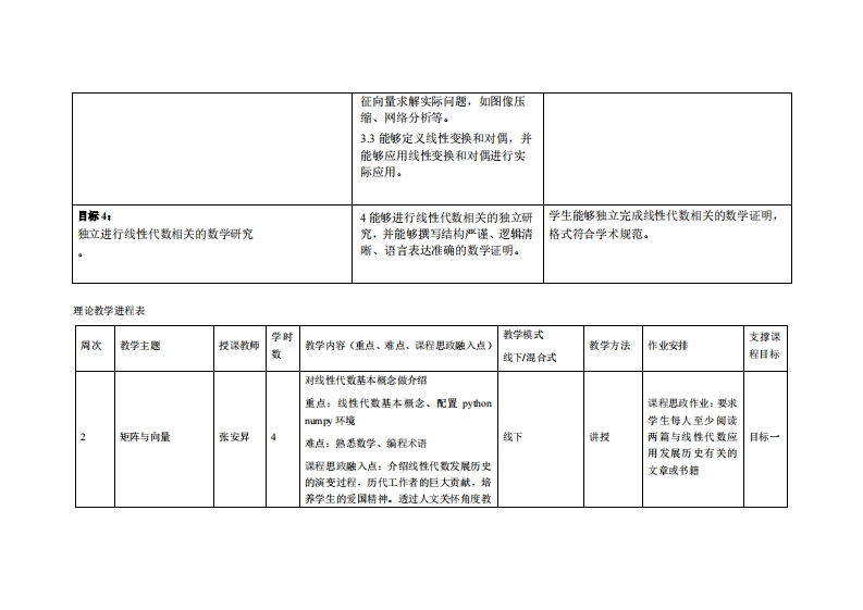 《线性代数》教学大纲课避名称:赖性代款课和类别(必修选修)·必修课程文名称:Linear Algebra总学时周学时学分,403/2.5其中实检实减学时,0先修课是:无后续课度支燥授课时间:415周■期三57节、1617周■期三56节授地点:实315提课对津:2022级跨境电商1班2班开裸学跳:粤台产业科技学院任课就师姓名淋:张安异/副教授答时间、地点与方式:课堂或课后,教室或通讯软件,当面或线上答疑课避被方式开卷()闭卷()课程论文()其它()非试卷类报告使用教村《线性代数》,美]Gilbert Strang(吉尔伯特·斯特朗)ISBN9787302535560收学◆考资料:(1)自编材料课程衡介:本课程是跨境电商专业的通识教育必修课,讲述基础线性代数,内容包含线性代数的基本概念和方法,矩阵运算和线性方程组的解决方案,矩阵分析和线性变换在科学和工程中的应用。。授课方式将结合理论知识与实机操作(Pyhm),使本课程兼具理论性和实践性。