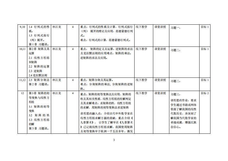 《线性代数》教学大纲课避名称:线性代数课忍类别(必修选修)事必修课程英文名称:Linear Algebra总学时周学时学分,403/2.5其中实险实液学时,0先继课是:无后续课程支撑概率论与数理统计等授课时间:9-16周星期五78节、周星期日911节授裸地点:机电楼3引2课对律:2023级跨境电商1班2班开裸学洗:粤台产业科技学院任课就师姓名淋:林江龙/教授答时间、地点与方式:课堂或课后,教室或通讯软件,当面或线上答疑课程考核方式:开卷()闭卷()课程论文()其它(v)使用数村:《线性代数》(第七版),同济大学数学系编,高等教育出版社,2023。妆学事考资料矩阵力量线性代数全彩图解+微课+Python编程娄伟生清华大学出版社,2023课程简介:《线性代数》是高等学校理工科专业及经管类各专业的重要基础课。本课程主要学习行列式、矩阵,维向量组的线性相关性,线性方程组求解,相似矩阵以及二次型的基本概念、基本理论和基本的运算技巧,为理工科专业的后续课程及重要竟赛莫定必要的数学基础。课程就学目标及对华业要求指标点的支排:课应被学目标支撑毕业2要求指标点毕业要球课程目标1:1-工程知识:能够运用数学、基础科学、工程知识能够运用数学、基础科学、计算机科学学习行列式、矩阵,维向量组的线性相关性,方程组求计算机科学与技术、商务管理等相关知与技术、商务管理等相关知识,对于智能互联网系解,相似矩阵以及二次型的基本概念、基本理论和基本的识,对于智能互联网系统开发运维所涉统开发运锥所涉及的软件工运算技巧:了解党史,树立从易到难、循序渐进、脚踏实及的软件工程、人工智能信息工程、商程、人工智能信息工程、商务信息管理等问题具有
