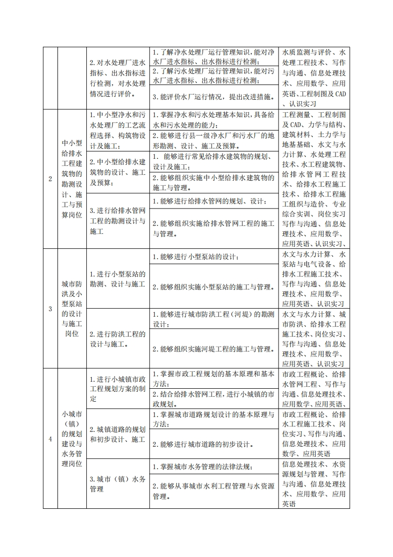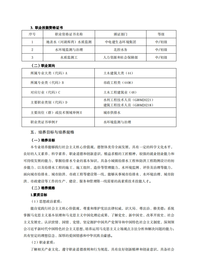 《给排水工程技术》专业人才培养方案一、专业名称及代码专业名称:给排水工程技术专业代码:440602二、入学要求招生对象:高中(中职)毕业生或具有同等学力者。招生类型:文理兼收。三、修业年限三年。四、职业面向(一)职业能力分析1.专业服务面向经过行业企业需求调研以及跟踪近三年本专业毕业生的就业岗位,其中多数毕业生就业于给排水工程施工企业、水利工程施工、水环境治理及管理单位,少数毕业生就业于相关土建行业施工企业、工程管理等单位。(1)面向的主要技术岗位有:①施工技术管理岗位(施工员或技术员、测量员、资料员);②工程造价管理岗位(造价员、资料员):③水质监测岗位(化验员、资料员):④水处理技术岗位(技术员、信息管理员、造价员)。(2)面向次要技术岗位有:①勘测设计辅助岗位(测量员、绘图员、资料员);②工程运行管理岗位(技术员、工程运行调度及维护人员):③土建行业施工岗位(施工员、质量员、资料员、测量员等。2职业岗位与职业能力分析职业岗位与职业能力分析表序工作号岗位典型工作任务职业能力支撑课程1.对地表水、地下1.掌握一般水质分析的基本知识,具备水水文与水力计算、水水质监水进行水质监测,环境监测的能力:质监测与评价、写作测与检并对水环境进行评2.了解水质评价的基本知识,具备水环境与沟通、信息处理技验岗位价,同时提出治理评价的能力:术、应用数学、应用措施。3.具备城市水环境初步治理的能力。英语、认识实习
