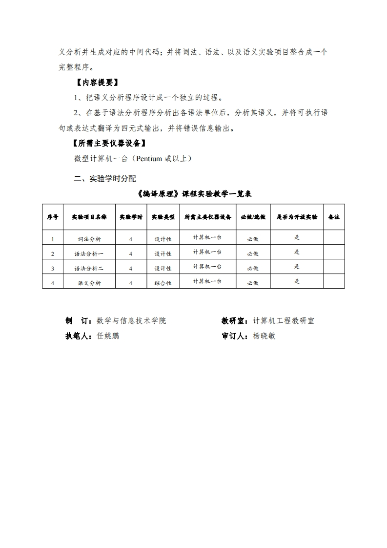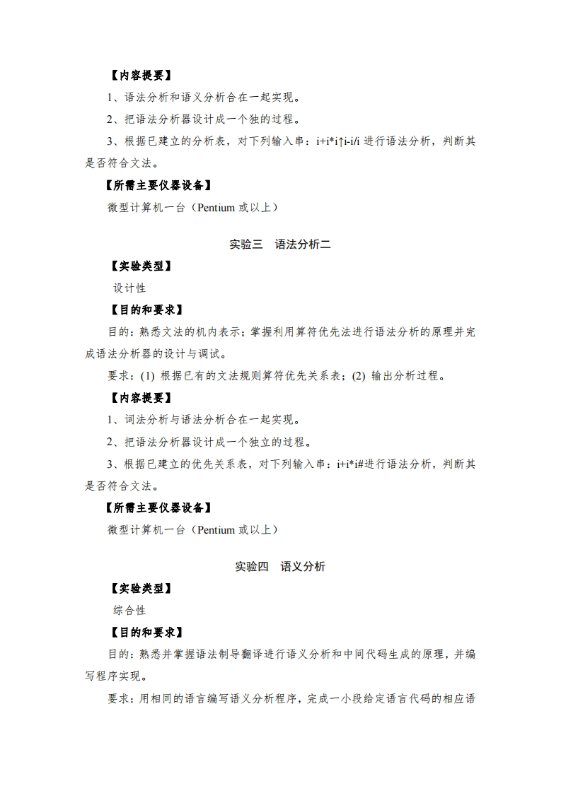 《编译原理》实验教学大纲一、实验教学内容及要求实验一词法分析【实验类型】设计性【目的和要求】目的:了解和掌握词法分析的方法,编程实现给定源语言程序的词法分析器,并利用该分析器扫描源语言程序的字符串,按照给定的词法规则,识别出单词符号作为输出,发现其中的词法错误。要求:(1)从键盘上输入源程序:(2)处理各单词,计算个单词的值和类型:(3)输出个单词名、单词的值和类型。【内容提要】1、设计一个简单的程序设计语言(语言中有若干运算符和分界符:有若干关健字:若干标识符及若干常数)2、确定编译中使用的表格、词法分析器的输出形式、标识符与关键字的区分方法。3、把词法分析器设计成一个独立的过程。【所需主要仪器设备】微型计算机一台(Pentium或以上)实验二语法分析一【实验类型】设计性【目的和要求】目的:熟悉文法的机内表示:掌握利用预测分析法进行语法分析的原理并完成语法分析器的设计与调试。要求:(1)根据已有的文法规则建立LL(1)分析表;(2)输出分析过程。