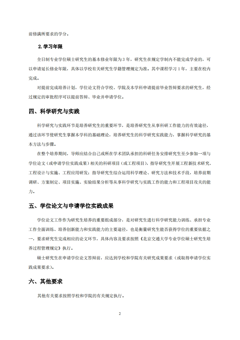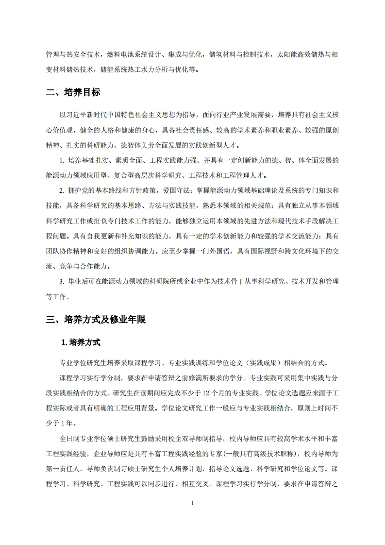 能源动力专业学位硕士培养方案(学科代码:085800授予能源动力硕士专业学位)机械与电子控制工程学院一、学科专业及培养方向能源动力工程一级学科以能源的高效洁净开发、生产、转换和利用为核心,以研究能量在热、光、势能和动能等形式之间转化或互逆转换过程中能量转化、传递的基本规律为基础,旨在有效实现各种能源过程的设备和系统的设计、制造与运行。该学科涵盖了能源的获取、转换、传输和应用的全链条,是推动能源技术创新与可持续发展的关键学科。本学位点依托新能源汽车动力总成技术北京市重点实验室、微细尺度流动与相变传热北京市重点实验室、载运工具先进制造与测控技术教育部重点实验室、轨道车辆运用工程国家级国际科技合作基地、新能源汽车技术产学研联合研究生培养基地,在航天动力工程、清洁能源和储能工程两个学科方向培养研究生,旨在培养具备扎实的能源科学与工程基础知识,掌握先进的能源技术与管理方法,具备解决复杂工程问题能力的高素质应用型人才。本学位点师资力量雄厚,导师承担多项国家、省部级以及企业委托项目,与企业联系紧密,以实际应用为导向,以职业需求为目标,注重培养实践研究和创新能力,增长实际工作经验,缩短就业适应期限,提高专业素养及就业创业能力。主要研究方向及其内容:1.航天动力工程研究先进航天推进系统关键技术,包括绿色无毒液体空间推进技术、微推进技术、新概念推进技术设计与测试,高超声速飞行器燃料强化喷雾燃烧技术,超临界流体喷雾燃烧机理,声电及非定常效应强化雾化技术等:研究智能航天动力系统流动传热技术,包括发动机燃烧室-涡轮流固热耦合机理,发动机燃烧/传热仿真与流场测试技术,推进剂雾化与燃烧仿真及智能控制技术,超/高超声速气动热/力实验与仿真技术,卫星热控及高超飞行器热防护技术等。2.清洁能源与储能工程研究先进能源转换与利用技术,包括先进燃烧与气化机制,太阳能热利用与热泵技术,核电反应堆热工水力设计与分析,数字堆技术,等离子体辅助点火燃烧与低碳燃料合成及转化,固废减容及资源化利用技术:研究能源系统集成、控制与优化,包括混合能源与动力系统构型与控制,多能协同转化过程与系统优化,清洁能源系统仿真技术,新能源汽车整车控制及热管理技术,固废核素迁移与调控技术等:研究先进电池技术、高效储能技术及热管理,包括锂电池高效高安全利用及热