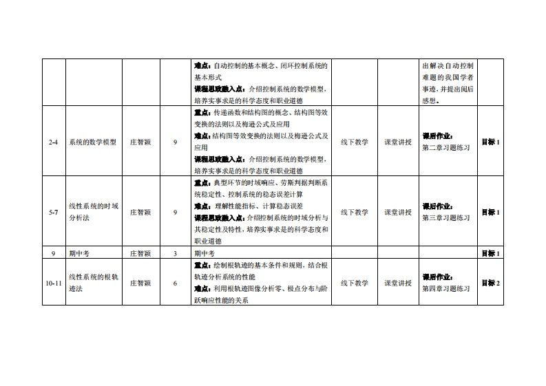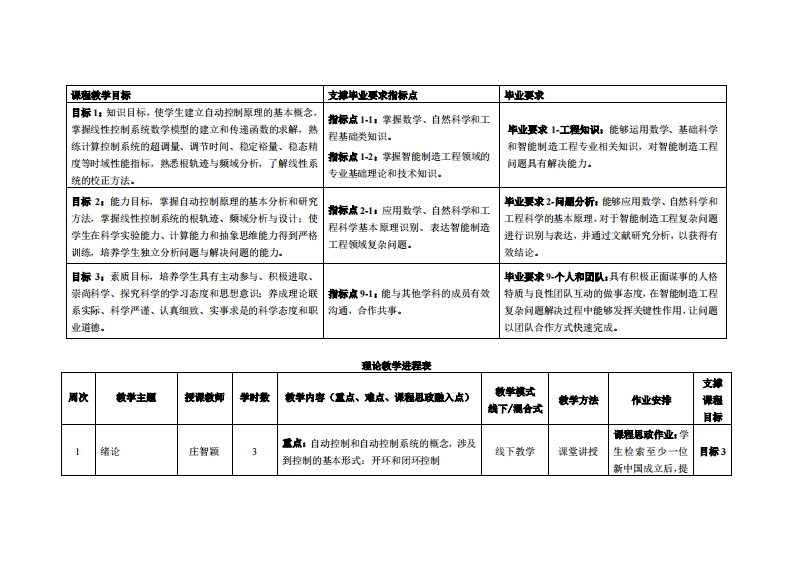 《自动控制原理》教学大纲裸避名称,自动控制原理课和类别(必修选修)必修课程英文名称:AutomaticControl Principle总学时周学时学分,48型33其中实险实液学时,6先课是:高等数学、线性代数后续课程支撑机电传动与控制、工业机器人技术基础、数控加工与编程授课时间:1-16周星期二5-7节授课地点:莞城6311课对津:2023智能制造2班开裸学陕:粤台产业科技学院任课就师姓名称:庄智领/副教授答展时间、地点与方式:1每次课的课前、课间和课后,采用一对一的问答方式:2每次习题课,采用集中讲解方式。课狸考核方式:开卷()闭港(√)课程论文()其它()使用村,《自动控制原理》,邹见效主编,机械工业出版社,SBN:978711155652。◆考妆村:《自动控制原理》,胥布工主编,电子工业出版社,ISBN:9787121279539。课在物介:《自动控制原理》是智能制造工程专业的一门重要的学科基础选修课程,亦是控制相关课程体系中的核心和主干课程,其主要内容包括了线性控制系统的数学建模、时域分析、根轨迹分析、频域分析、校正方法和校正装置设计,以及带入了非线性控制系统和离散控制系统的分析方法。《白动控制原理》是学生学习“计算机控制系统”、“运动控制系统”、“过程控制系统”、“电梯控制”、“电机控制等专业课程必需的基础知识,为学生日后从事控制系统性能分析、控制器设计等工作奠定基础。课程敏学目标及对毕业要求指标点的支排: