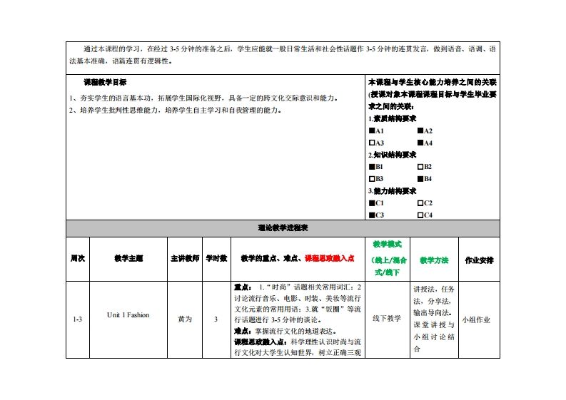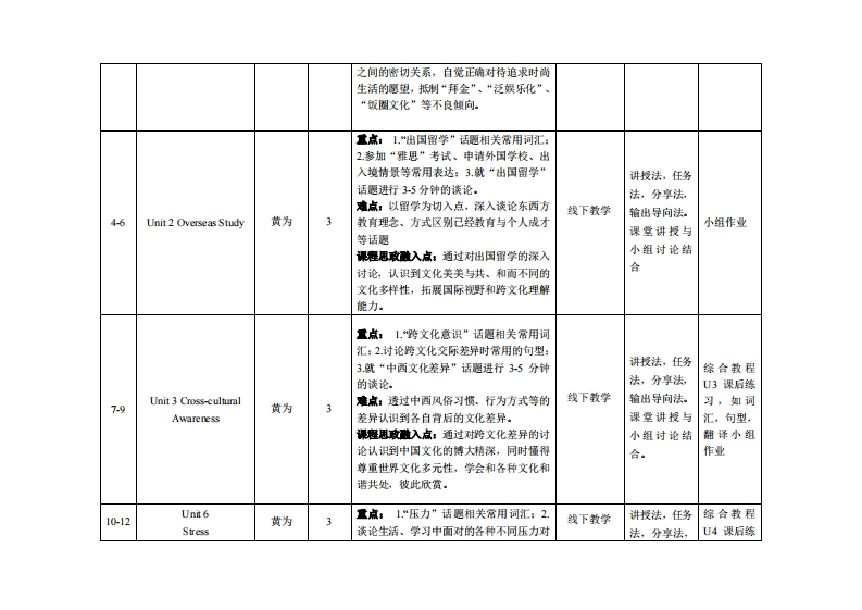 《英语口语2》教学大纲课程名称:英语口语课程类别(必体选修):必棒课程英文名称:Oral English总学时周学时学分,32/22其中实验实艘学时:先他课程:盖德英语授课时间:1-16周授裸地点:实406授课对律:事台学陕22领各责开课学洗:粤合产业科技学洗任课做师姓名职称:黄为讲师答疑时间、地点与方式:通过课堂面对面答凝,结合通过“优学院”等网络教学平台、微信(QQ》、电子郎件、电话等方式答疑,时间和地点依实际情况灵活处理。课程考被方式:开卷()闭卷(√)课程论文()其它()使用微材:21世纪大学新英语口语教程(上、下册)微学◆考资料:《D演讲》、《雅思口语全攻略》课容情介:《英语口语》课程是面向非英语专业学生的一门必修课。该课程以《大学英语教学指南》(2020版)为指导,通过该课程的学习,使学生通过形式多样的语言技能训练,能就日常生活中常用的话题用比较简单的英语准确地表达自己的思想。以达到在具体的社会语境中得体地使用语言的目的。基于新工科语言环境下的语言教学来提高用英语从事涉外业务的水平,内容包括工程伦理、风俗习惯、人际关系、校园生活、旅游观光、环保购物、留学求职等。另根据学生的专业、兴趣和未来职业需求,增加外交礼仪,职场交流等内容。结合线上线下混合式教学模式,本课程采用基于活动的英语教学模式,坚持“能力本位、任务驱动、行动导向、教学做一体化”的原则,做到“学中做,做中学”,以达到“学以致用”、“学以管用”的目的。在教学中,但导任务导向、目标导向教学法,积极鼓局学生参与语言活动,进行愉快学习。本课程着眼于帮助学生提高英语综口头表达能力,提高学生的跨文化交际能力,独立自主以及合作学习的能力,提升文化修养,培养职业精神与职业技能。