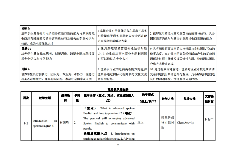 (英语口语4》教学大纲课避名称:英语口语4课忍类别(必修选修)事选修课程文名称:Spoken English4总学时周学时学分,1611其中实险实液学时,0先继课是:莫潘口话3后续课度支嫌授课时间:周三上午第24节周五上午第三节授课地点:305/313课对津:2021鞭经济与金敢(金敢科技、(金敢管理)/2021领智能制造工程2021领电于商务开裸学陕:粤合产业荆妆学陕任课柳姓名淋:林担均测做战答时间、地点与方式:通过课堂面对面答疑,结合通过微信(QQ》、电子邮件、电话等方式答疑,时间和地点依实际情况灵活处理。课程考核方式:开卷()闭卷()课程论文()其它(V)报鲁使用微材,超级商务英语口语.作者:(韩)自善丝著,洪宝善译出版社:吉摄影出版社.出版时间:2013年10月课程简介:英语口语4课程是一门综合应用型的英语课程,为了加强学生的口语及沟通技巧,学生应养成良好的学习态度及基本原理。所有的课程都用英文授课。目的在于加强学生的进阶英语口语能力及加强学生的进阶英语沟通技巧,透过反复练习英语口语字汇及句型以养成进阶口语表达的习惯,在教学过程中除了需要通过较为进阶的口语教学加强学生英语口语能力外,还需培养解决实际间题及应用能力如:语音学习、模拟谈判或是或创设虚拟的主题讨论环境等方而的学习。课程妆学目标及对毕业要求洲标桌的支排课应被学目标支撑单业要求指标点华业要求目标1:】运用英語口語操作能力与技巧并能具1具备从事跨境电商商务语言沟通工作所需的商务掌媒英語口語等领域所需的基础知识、应用能力、创新意备将生活與貿易清通问愿沟通解决的英语能力识和国际化视野能力