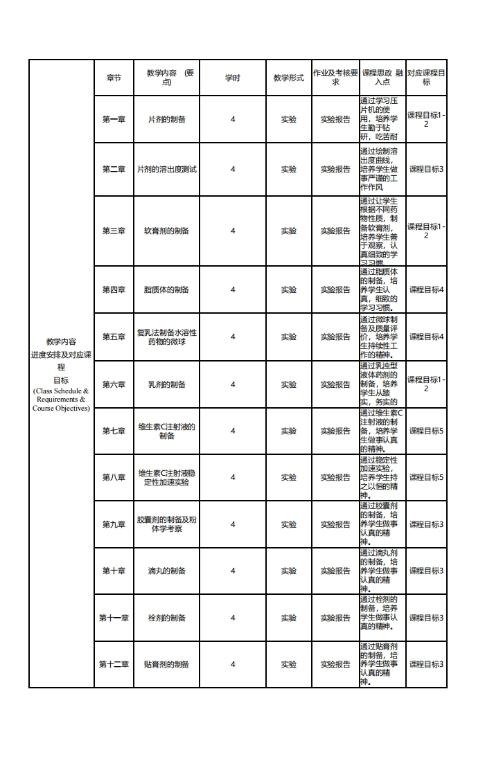 药剂学实验课程教学大纲课程基本信息(Course Information)课程代码PHAR3224学时48学分1.5(Course Code)(Credit Hours)(Credits)中文)药剂学实验课程名称(Course Name)英文)Pharmaceutics Lab.课程性质必修(Course Type)授课对象药学转业和临床药学专业本科生(Target Audience)授课语言(Language of权语Instruction)开课院系药学院(School)先修课程药剂学后续课程(Prerequisite)(post)课程负责人沈琦课程网址(Instructor)(Course Webpage)《药剂学实验》是药学专业本科生的必修课围绕药物制剂的处方研究、制备工艺以及质量控制设计实验。课程简价(中文)】程内容涉及最基本的剂型制备,学习过程中,学生亲白动手完成药剂学最基本的实验盆操作过程,掌握简单(Description)型制备方法,同时在实验过程中可以加对药剂学原理的理解。This course is a comprehensive applied technical science which exerts the modern scientifictechnique in research of manufacturing,quality-control and reasonable utilization ofpharmaceutics.The instructive purpose of this course is to persist the character of pharmaceutics,课程简价(英文)et the students have the abilities to improve dosage forms,study new drugs and solve quality(Description)problems in pharmacy.Through the course,the students are able to master the basic knowledgeand skill,such as the characters,preparation and quality-requirement of the dosage forms;amiliar with advanced manufacturing and application of pharmaceutics.课程目标与内容(Course objectives and contents)主要培养学生的动手能力与观察能勁,希望在教师的引导下,熟悉常用剂型的制备和质量控制项目.(B2.2)课程目标体会和领悟药剂学内涵与特点,使学生具有进行药物制剂性产和新药研发的基本素质。(B2.1,B2.3)》(Course Object)3、掌握常用剂型致如片剂、胶囊剂、栓剂、滴丸剂、贴膏剂的制备与评价。(B22)4.掌握新剂型如脂质体、微球等的制备方法与评价.(B2.2)5.掌搔主射液的制备及稳定性试验方法。(B2.2)