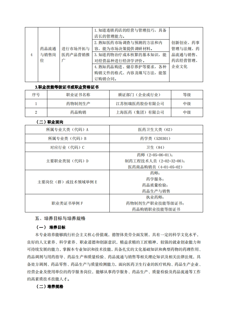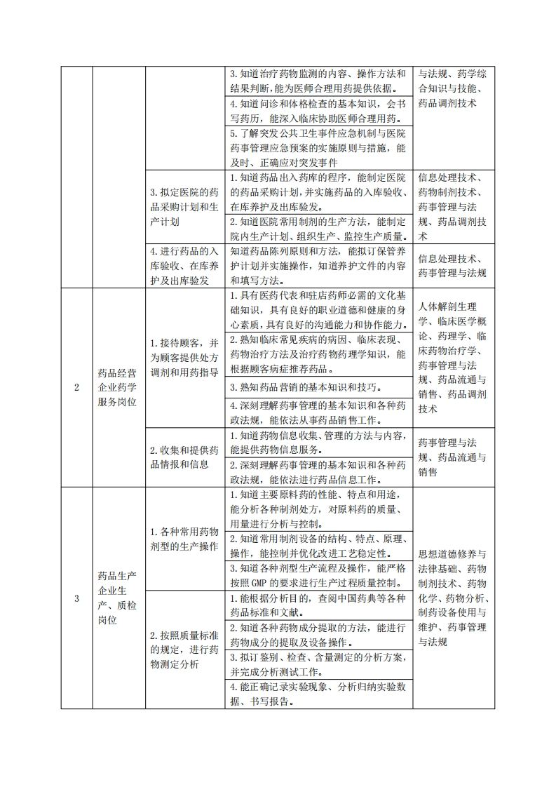 《药学》专业人才培养方案一、专业名称及代码专业名称:药学专业代码:520301二、入学要求招生对象:高中(中职)毕业生或具有同等学力者。招生类型:文理兼收。三、修业年限三年。四、职业面向(一)职业能力分析1.专业服务面向主要就业单位:医疗机构的药学服务岗位、药品经营企业(批发与零售)、药品生产企业及药品质量检验机构等。主要就业部门:医院药学部药房、药库、临床药学室、制剂室;药品经营企业(包括连锁药店和药品批发企业):制药企业生产部门、质检室、销售部门:药品检验监督部门等。2职业岗位与职业能力分析序号工作岗位典型工作任务职业能力支撑课程1.素质目标:具备药学技术人员必备的综合素质:熟知临床常见疾病的病因、临床表现及药物治疗方法。写作与沟通、人体解剖生理学、2.知识目标:明确临床常用治疗药物的分临床医学概论、类、体内过程、药理作用、临床应用、不1.实施处方审核微生物与免疫良反应、用药注意事项、特殊人群医药、与调配,并指导学、药理学、临药物相互作用、用法、配伍禁忌等药理学医院药学患者合理用药相关知识。床药物治疗学、服务岗位3.能力目标:明确处方审核与用药指导的药学综合知识与技能、药品调剂内容,能完成处方调剂工作。技术4.明确药学咨询的内容,能对医师、护士、患者及公众实施药学咨询服务。1.知道不良反应分类、辨别、收集与报告应用英语、临床2.开展治疗药物程序,能及时进行不良反应的收集和报告。医学概论、药理监测2.掌握文献检索、资料查询的基本方法,学、临床药物治具有学习能力和一定的科学研究能力。疗学、药事管理