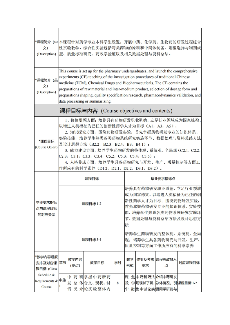 《药学研发实验》课程教学大纲课程基本信息(Course Information)课程代码*学时*学分PM411642(Course Code)(Credit Hours(Credits)◆课程名称(中文)药学研发实验(CourseName)(英文)Drug R.&D Experiment课程类型必修课(Compulsory Course)(Course Type)授课对像(Target药学专业本科生(Undergraduate student)Audience)授课语言(Language of中文(Chinese)Instruction)·开课院系药学院(School of Pharmacy)(School)生药学,天然药物化学,生物技术药物,药物化学,药理学,药物分析学,药剂学,药事管(Pharmacognosy,NaturalMedicinal Chemistry先修课程后续课Biotechnological Drugs(Prerequisite)Medicinal程无Chemistry(post)PharmacologyPharmaceutical AnalysisPharmaceuticsPharmaceutical Affairs Management)课程网课程负责人邱明丰(Mingfeng Qiu)址张宝红(Baohong Zhang)(Instructor)(Course无刘燕(Yan Liu)Webpage
