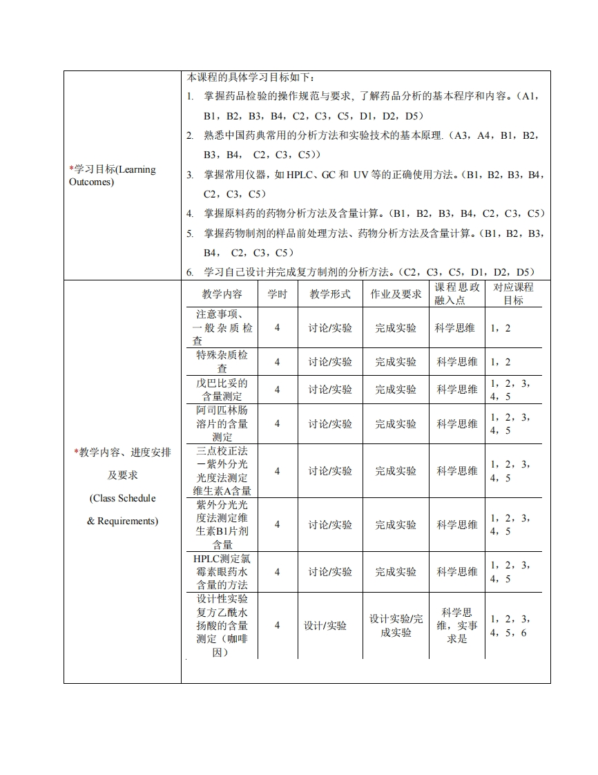 《药物分析实验》课程教学大纲课程基本信息(Course Information)课程代码*学时*学分PM318(Credit32(Course Code)(Credits)Hours)*课程名称药物分析(Course Name)Experiment for Phammaceutical Analysis课程性质必修:Mandatory(Course Type)授课对象(Audience)药学专业本科生:T hird-grade Pharmacy undergraduates授课语言(Language of Instruction)中文/Chinese*开课院系(School)药学院:School of Pharmacy先修课程《无机与分析化学》、《仪器分析》(Prerequisite)《Inorganic and analytical chemistry》、《Instrumental Analysis》授课教师课程网址(Instructor)王彦:Wang Yan(Course Webpage)无《药物分析》是药学专业本科必修课程,授课对象为本科三年级学生,开课时间是第六学期。《药物分析》主要是运用化学、物理化学或生物化学的方法和技术研究化学结构已经明确的合成药物或天然药物及其制剂的质量控制方法的一门*课程简介学科。《药物分析实验》是《药物分析》的实验课程,使学生在掌握药物分析的(Description)相关理论和技术的同时,通过实验熟悉中国药典常用的分析方法和实验技术的基本原理,及常用仪器的正确使用,了解药品分析的基本程序和内容,掌握药品检验的操作规范与要求:培养学生具有研究药品质量的科学的实验态度,基本的思路和方法。Pharmaceutical analysis is a mandatory course for all undergraduates of Pharmacymajors during the 6th semester.Pharmaceutical analysis studies the analysis and qualitycontrol of chemical drugs,natural drugs and their formulations,using variety ofscientific methods and technologies.Experiment for Pharmaceutical Analysis is the*课程简介experimental course of the pharmaceutical analysis.Through the experimental training(Description)with pharmaceutical analysis and the introduction of standard operation procedures fordrug quality control,students will get familiar with the general methods and techniquesin pharmacopeia,master the standard operation skills for drug quality control,and havethe ability to conduct the drug testing.At the same time,the experimental class will helpthe students to develop the thinking skills for the drug quality control and analysis,andacquire the ability to engage in the research of pharmaceutical analysis.课程教学大纲(course syllabus)