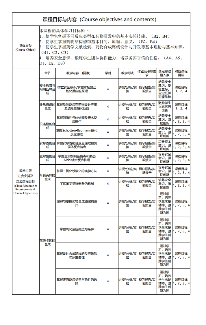 药物化学实验课程教学大纲课程基本信息(Course Information)课程代码PHAR3218学时48学粉1.5(Course Code)(Credit Hours)(Credits)(仲文)药物化学实验课程名称(Course Name)(英文)Medicinal Chemistry Experiment.课程性质必修课(Compulsory Course)(Course Type)授果对象药学专业和临床药学专业本科生(Undergraduate student)(Target Audience)授课语言(Language of双语(Bilingual)Instruction)开课院系药学院(School of Pharmacy)(School)先修课程药物化学,有机化学后续课程药物研发实验(Prerequisite))(post)课程负责人课程网址刘燕(Coursettps://oc.sjtu.edu.cn/login/canvas(Instructor)Webpage)《药物化学实验》为药学专业本科生必修实验课,授课对象为本科三年级学生,开课时间为第6学期。课程采用自编中英文教材为实验指导书,多媒体展示,双语授课,学生自主设计与验证实验。教学内容包括经典药物合成实验与学生独立设计实验两部分内容,经课程简介(中文)典药物合成实验部分要求学生掌握药物合成原理、合成操作技能、纯化技巧、鉴定与分析(Description)手段等具体化学技巧:学生自主设计实验部分由文献检索、路线比较、实验设计、PPT展示、学生讨论、老师审定、独立实验等环节组成。教学采用多媒体技术辅助,并融入学生参与讨论、展示、陈述、互评等教学方法,使学生具备基本实验动手能力,及独立设计、合成各种药物的意识。Medicina/Chemistry Experments is a compulsory experimental course for all juniorundergraduates of pharmacy majors during the 6TH semester.It adopts English textbookedited by professor Shaoshun Li as the guide book for all the experiments required.Thecourse aims at training learners'basic ability in experimental operation and developingtheir conception of designing and synthesizing various drugs.It will enable leamers to课程简介(英文)appropriately master the principles of drugs synthesis,experimental operation,(Description)ourification technologies,and analysis methods.It also helps leamers review theiteratures,and compare the avdantages and disavantagesof all the syntethic routes,and understand what the rational design of medicinal chemistry experiment is.Thecourse adopts multmedia internet technology coupled with diverse teaching methodssuch as discussion,presentation,mutual evaluation and so on.