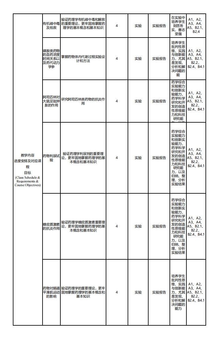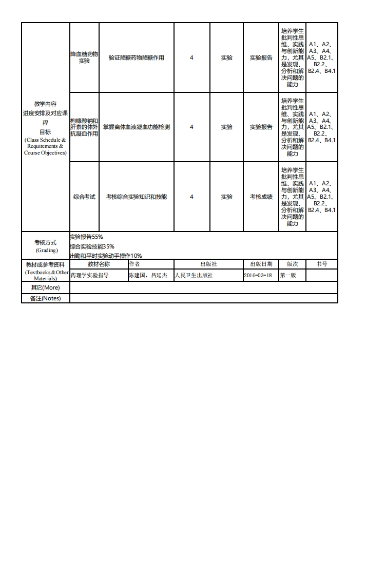 药理学实验课程教学大纲课程基本信息(Course Information)课程代码PHAR3222学时48学分1.5(Course Code)(Credit Hours)(Credits)课程名称中文)药理学实验(Course Name)英文)Experimental Pharmacology课程性质(Course Tpel授课对象(Tareet Audience)授课语言(Language of中文Instruction)开课院系药学院(School)先修课程后续课程(Prereauisite)not】课程负责人课程网址李欣燕(Instructor)(Course实验药理学课程除了培养学生动手能力、加深对课堂理论知识的理解外,其连点目标为培养学生的职业素养,优其是科研素养。该课程分为理论教学部分和实验操作部分,理论教学部分每次安排1-15学时,安排在每次果程简介(中文)验操作前或实验结束后,主要从实验动物学、药物筛选、药效学研究、药物体内过程研究、药物安全性评价(Description)几方面讲述,使学生对新药研发和新药报批中所涉及的关键问题有所了解:实验内容上,除经典实验外,另结合有关实验室的科学研腕,特设2次研腕成果转化的学生实验,让先进出的科学研究走近学生:另特设关于新药The Course is one of the basic major courses for the above majors.It is the MajorRequired and CoreSubjects for Mechanical and Power machinery Engineeringstudents.1)Articulate the properties that distinguish fluids from other forms of matter,and the broad range ofengineering applications and natural phenomena thatinvolve fluid mechanics.2)Understand and analyze the basic moving equations on flow field,for example,correctly interpret课程简介(英文)he physical meaning of Bernoulli equation,boundary layerequations,and estimate levels of(Description)approximation in engineering models;B)Understand the meaning of laminar flow and turbulent flow,estimate the flowloss in viscous fluid4)Applybasic principles to engineering analysis,and apply dimensional analysis andsimilitude to thedesign of experiments,and to the representation andinterpretation of data.Properly interpret theeynolds number and otherfundamental nondimensional parameters,and their roles in defining课程目标与内容(Course objectives and contents)课程目标吏学生更好地掌握理论知识提高动手能力以及解决问题的能力章节教学纳容要点学时教学形式作业及考核要课程思政对应课程目求融入点标在实验中药理学实验培养学生A1、A2A3、A4的基本知识掌握药理学实验的基本方法4实验实验报告刻苦务教学内容A5、B2.1和基本技术实、意志B2.4进度安排及对应课坚强程药物半数有在实验中1、A2目标效量掌握跪性毒性实验基本原理和培养学生实验实验报告刻苦务A3、A4(Class Schedule(ED50)操作实、意志A5、B2.1Requirements&的测定坚强B2.4Course Objectives)验证药理学镇痛药A1、A2药物的镇痛验正药理学镇痛药物的重要理实验A3.A4论,更牢固地掌握药理学的基实验实验报告物的重要理论,更A5.B2.1本概念和基本知识牢固地掌B2.4损药理学