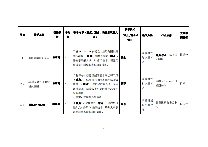 《虚拟场景设计》教学大纲课应名称,业敬场量设计课和类别(必修/选修),选修课程英文名称:Virtual Environment Design总学时/周学时/学分32/2/2其中实检/实减学时,16先修课塞:后续课程支推授课时间:周一5-6节授课地点:实114课对律:2020多媒体设计专业开裸学洗:粤台产业科技学院任课总师姓名只称:林明前讲师答展时间、地点与方式:(2-17)周、实114、讨论课程考核方式:开卷(√)闭卷()课程论文()其它(√)使用妆村,《虚拟场景设计制作》南京大学出版社钟垂贵者:2018年,SBW:9787305214929。课难葡介:本课程教授学生了解虚拟设计理论及应用,虚拟与场景结合之综合运用,及视觉与之互动的虚拟呈现。技术层面,教导学生电脑图学技术与虚拟场景之关联,例如运用虚拟实景软件工具,模拟虚拟场景创作。在授课过程中,引发学院兴趣,激发学习应用动机,触类旁通开展相配套的操作实践,使学生对虚拟实景具有更直观的感性化认识,为未来影视与电脑制作虚拟场景及现实世界连接打下基础。课程数学目标及对毕业要求州标点的支排:课被学目标支撑单业要买求指标点华业要求目标1:C2.设计与执行多媒体设计、影视动画与文化创(专业基础知识与创新能力)知认面使学员认识虚拟设计专业知识整合能力:意产业设计专业相关实践,以及分析与整合能基础理论由来及应用,虚拟与影视场景结合之综合运用,技术工具应用能力:力.及视觉与之互动的虚拟呈现。