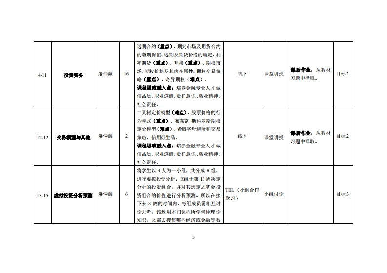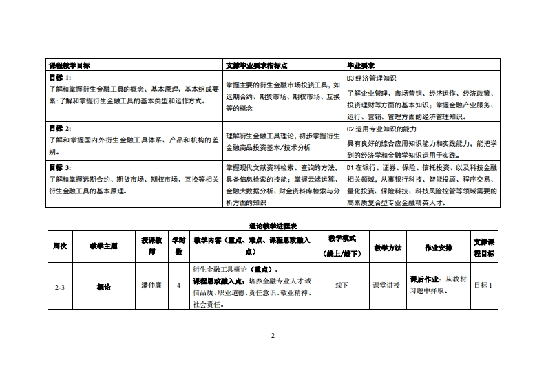 《衍生金融工具》教学大纲课程名称,新生金融工具课忍类别(必修选修)选修课程英文名称:Financial Derivative总学时周学时学分,322/2其中实险实玻学时:8先修课庭:阅经济举、老现经济学、贷币限行单、公司金融、会计学后续课程支推财言管道专愿漫课时间:2-17周星期二1-2节授课地点:实3引4课对津:21金融1、2班开裸学陕:粤合产业荆妆学陕任课放甲姓名淋:潘仲藤/副教授答展时间、地点与方式:周二34节,实307,188141023161.课堂:每次上课的课前、课间和课后进行答疑:2.线上:建立微信课程群,实施线上答疑,课狸考拔方式:开卷()闭卷()课程论文()其它()实拟查使用微村:《衍生金融工具》王晋忠主编(第2版)、中国人民出版社2021年11月教学参考资料:《衍生金融工具基础》,任翠玉着,机械教育出版社2018年9月课程物介:《衍生金融工具》是金融专业选修的核心课程。本课程以国内外衍生金融工具为研究对象,解释衍生金融商品市场运行的现象与内在规律,探求实现资本市场均衡的一门独立学科。本课程全面、系统地介绍了衍生金融商品理论的结构和内容,闸述了衍生金融商品理论和实践在当今最新发展的介绍和分析,特别注重引导学生以衍生金融工具的基本原理认识、分析和把握现实衍生金融工具发展过程中所存在的问题,培养学生的衍生金融工具素养和分析解决实际问题的能力。课程教学目标及对华业要求指标点的支排: