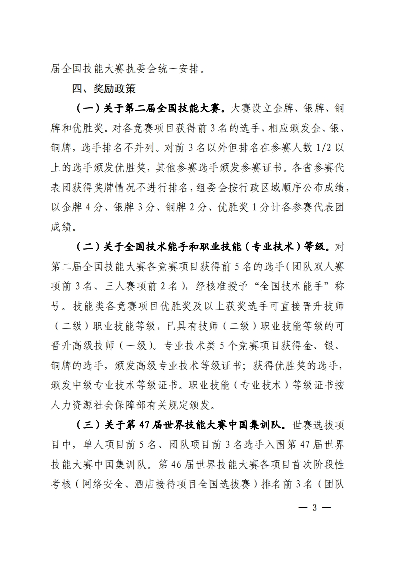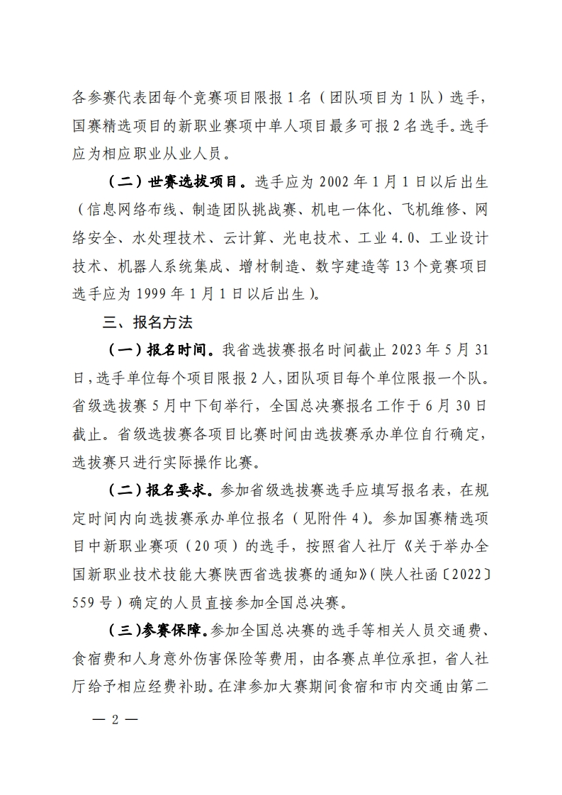 陕西省人力资源和社会保障厅陕人社函〔2023〕150号陕西省人力资源和社会保障厅关于做好第二届全国技能大赛陕西省选拔赛有关工作的通知各市(区)人力资源社会保障局,省级有关部门,中央驻陕企业、省属企业,行业组织,有关院校:根据人社部《关于举办中华人民共和国第二届职业技能大赛的通知》(人社部函〔2023〕6号)精神,为做好我省第二届全国职业技能大赛陕西省选拔赛有关工作,现就有关事项通知如下。一、竞赛项目第二届全国技能大赛定于2023年9月16日至18日在天津举办,分世赛选拔项目和国赛精选项目,共109个竞赛项目(见附件1)。其中,世赛选拔项目63个,作为第47届世界技能大赛全国选拔赛;国赛精选项目46个。二、参赛条件(一)国赛精选项目。凡16周岁以上(2007年1月1日以前出生)入法定退休年龄以内的中国大陆公民均可按属地原则(在当地学习或工作满1年以上)报名参赛省级选拔赛。全国决赛时,