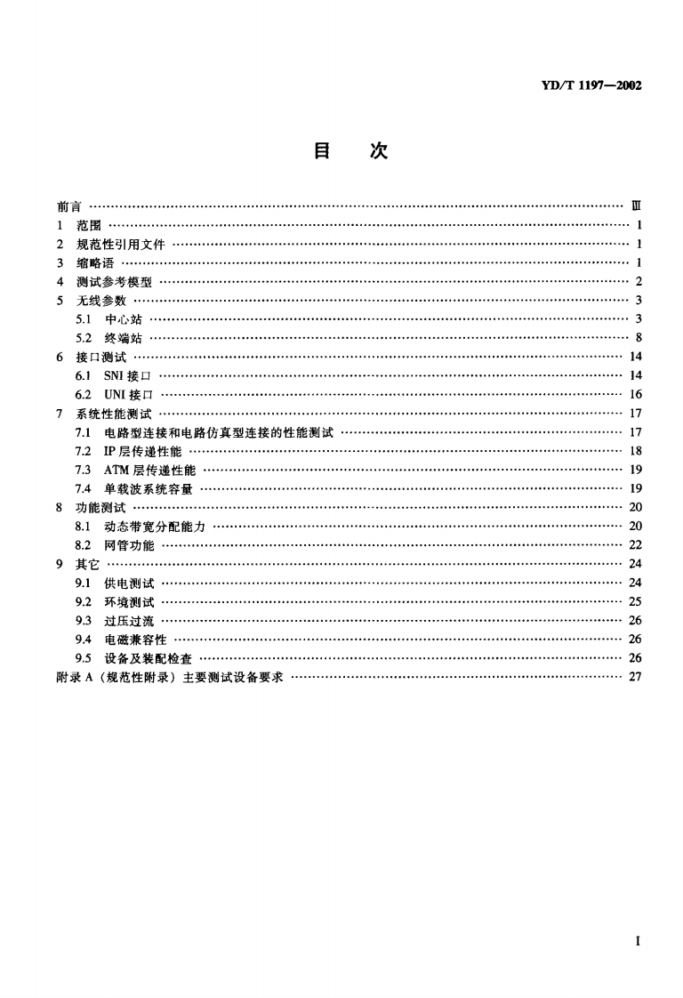 YD-T1197-2002348072@abc4个月前发布关注私信0.88MB31页049YD-T1197-2002此内容为付费资源,请付费后查看¥21¥31黄金会员免费钻石会员免费立即购买您当前未登录!建议登陆后购买,可保存购买订单付费资源 第1页 / 共31页 第2页 / 共31页 试读已结束,还剩29页,您可下载完整版后进行离线阅读 THE END标准规范 文本预览 1CS33.040.50M19YO中华人民共和国通信行业标准YD/T1197-2002接入网测试方法一3.5GHz固定无线接入Test specification for access network-3.5GHz fixed wireless access2002-06-21发布2002-06-21实施中华人民共和国信息产业部发布 查看更多 收起部分 喜欢就支持一下吧收藏