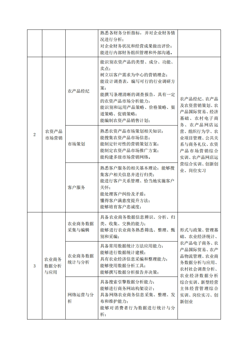 《现代农业经济管理》专业(村干部班)人才培养方案一、专业名称及代码专业名称:现代农业经济管理专业代码:410119二、入学要求招生对象:农村干部、乡村基层工作人员招生类型:文理兼收三、修业年限弹性学制:3-5年四、职业面向(一)职业能力分析1.专业服务面向对本专业学生的主要面向农业经理人等职业,农业企业经营与管理、农民专业合作社经营与管理、农业商务数据分析与应用、农产品及农资营销策划、农产品网店(实体店)运营等岗位(群)。2.职业岗位与职业能力分析序号工作岗位典型工作任务职业能力支撑课程能进行人员招聘计划的编制和实施:形式与政策、管理基人力资源管理能够完成企业人员培训:础、会计基础、农业绩效考核制度的编制和执行:会计实务、新型经营能够编写产品质量控制总结:主体经营管理、组织能够编制生产计划并组织实施:农产品生产作行为学、经济基础、能够执行安全生产操作,以及安全生产业管理农业经营管理、农村监督:投融资与税收、农村农业企能进行料工费的控制及预决算:法律政策、农业产业业、农民合作社、掌握质量管理工作的常用方法和工具:化、休闲农业与乡村家庭农场农产品质量管掌握验收抽样和工序控制的方法:旅游、乡村振兴与可经营管理理掌握质量设计的方法和技术:持续发展、乡村领导掌握质量成本的概念以及计算方法和评实务与村民自治、农价方法。业项目管理、专业认知实训、新型经营主能熟练运用资金预算编制方法进行财务体经营管理综合实预决算及控制:训、市场运营模拟训财务管理能编制资金预算:练、岗位实习、创新能熟练分析资金结构和使用状况:创业能制定企业筹资、投资决策并实施: