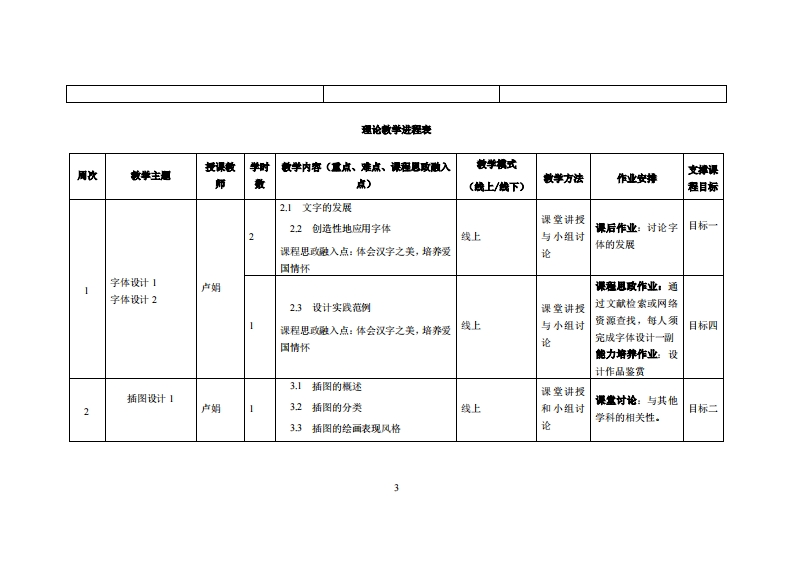 《视觉传达设计》教学大纲课应名称,视觉传达设计课和类别(必修选修):必修课程英文名称:Visual Communication Design总学时周学时学分,3224其中实检实液学时,16先修课塞:无后续课程支撑Unity3.D虚拟现实、艺术与设计营销授课时间:周三14节,2-9周授课地点:实114机房提课对津:22多煤排技术1班开裸学陕:粤合产业科妆学陕任课就甲姓名琳:卢娟讲师答振时间、地点与方式:粤合实114、撒信课程考核方式:开卷(√)闭卷()课程论文()其它()使用微村:《视觉传达设计】妆学事考资料:《字体设计与应用》、《广告设计》、《标志设计》等课避情介:视觉传达设计是多蝶体设计专业的一门专业课,本课程借鉴传播学、符号学、视觉心理学等理论的研究成果,以设计的基本功能一一传达为主线,以媒介视觉为核心,并结合设计的造型手段和在各种媒介中的应用,来实践视觉传达设计的基本原理,其中包括字体设计、标志设计、V1设计、广告设计等内容。课程放学目标及对毕业要求指标点的支排:裸程妆学目标支撑毕业要求指标点毕业琴求