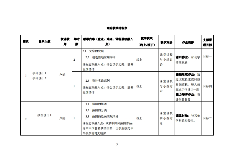 《视觉传达设计》教学大纲课避名称:视觉传达设计课类别(必修选修)事必修课程英文名称:Visual Communication Design总学时周学时学分,3224其中实检实减学时,16先修塞:无后续课程支撑Unity3.D虚拟现实、艺术与设计营销授课时间:周三14节,1-8周授课地点:实验楼615机房提课对津:21计算机故术设计1班开课学瑰开课学洗:粤合学陕任课就师姓名称:卢娟讲师鞭时间、地点与方式:鼻合T11、撒信课程考核方式:开卷()闭卷()课程论文()其它()使用微村,(视觉传达设计》妆学事考资料:《字体设计与应用》、《广告设计》、《标志设计》等课程情介:视觉传达设计是多媒体设计专业的一门专业课,本课程借鉴传播学、符号学、视觉心理学等理论的研究成果,以设计的基本功能一一传达为主线,以媒介视觉为核心,并结合设计的造型手段和在各种媒介中的应用,来实践视觉传达设计的基本原理,其中包括字体设计、标志设计、VI设计、广告设计等内容。课程数学目标及对毕业要求州标点的支排:裸程妆学目标支撑单业2要买求指标点业要求目标1:1-3掌握视觉传达设计的基本概念、原2-问题分析:能够应用数学、自然科学和工程科学(专业基础知识与创新能力)培养学生具备多媒体设计、理和方法,能够将所学知识用于解决化的基本原理,对于多媒体设计复杂问题进行识别与