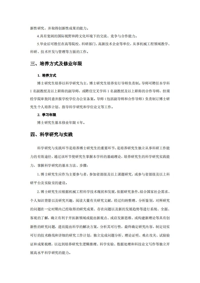 詹天佑学院本博连读学生研究生阶段培养方案机械工程(学科代码:0802授予工学博士学位)一、学科专业及研究方向机械工程学科是研究机械产品和系统设计、制造、检测、控制的理论、技术、装备以及应用的学科。北京交通大学机械工程学科始建于1958年,1990年获车辆工程二级学科博士学位授予权,1996年评为铁道部重点学科,2003年获机械设计及理论二级学科博士学位授予权,2005年获机械工程一级学科博士学位授予权.本学科拥有国家级实验教学示范中心、国家级工程实践教育中心、教育部重点实验室、教育部工程研究中心、北京市重点实验室等科研教学平台。长期以来,本学科聚焦学科发展国际前沿、对接国家重大需求、发挥学科优势、拓展学科范围、优化学科布局,以轨道交通与航天国防为主要服务行业,以轨道车辆及运载工具为主要研究对象,开展高水平人才培养及科学研究工作,形成了特色鲜明的学科研究方向:1.先进加工与智能制造研究轨道交通、航空航天、能源等领域复杂零件的高效高精度加工工艺、刀具轨迹规划和加工表面完整性,以及难加工材料与零件的精密和超精密加工基础理论与方法,并开展相关的装备研发与工程应用研究。面向人一机-信息融合的智能制造场景,从系统角度出发,研究智能制造系统模式及设计、运行优化,研究人的因素与系统集成,优化系统效率、质量以及成本等各项关键性能指标。2.智能测控与故障诊断研究航空航天、轨道交通、电力等领域的电量及非电量精确测量、信号处理技术,基于人工智能、物联网与嵌入式技术的测控系统设计基础理论与方法,研究基于波谱分析、图像处理、无损检测、机器学习等技术的智能检测与故障诊断方法。开发面向多种应用领域的测试分析设备、智能检测机器人等应用系统。3.智能机械设计与机器人技术研究机器人设计与应用的基础理论与核心技术,包括机器人结构学、运动学与动力学分析与设计,新型操作机器人和移动机器人的创新设计理论与方法,机器人运动与力控制的策略和算法,机器人智能感知以及智能控制等:研究机电液磁一体化系统设计和控制的基础理