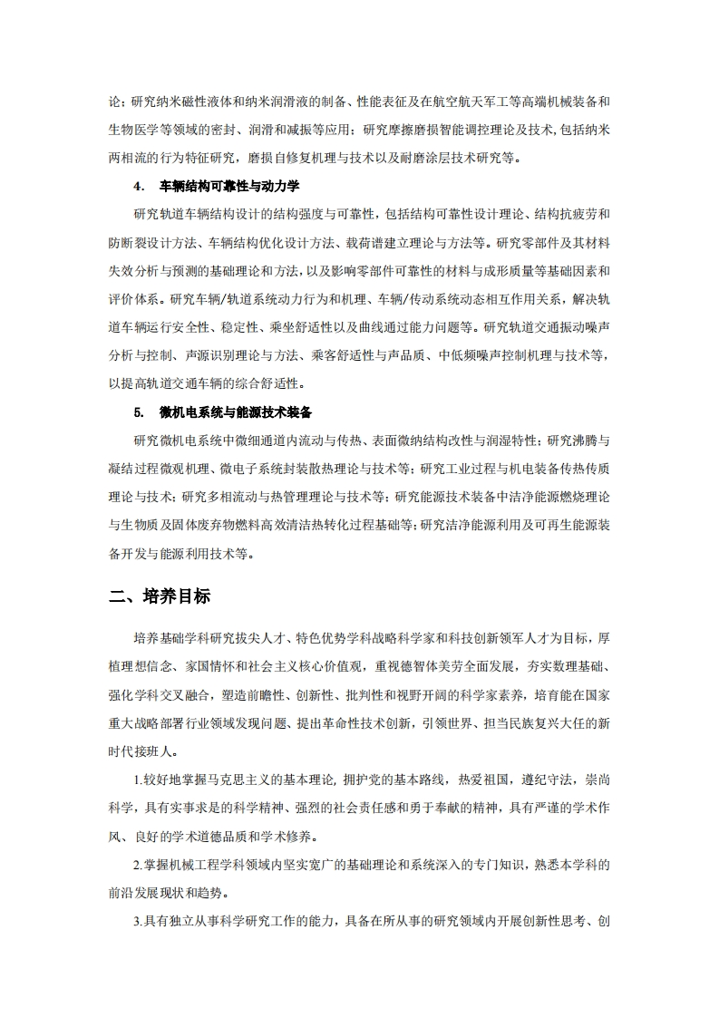 詹天佑学院本博连读学生研究生阶段培养方案机械工程(学科代码:0802授予工学博士学位)一、学科专业及研究方向机械工程学科是研究机械产品和系统设计、制造、检测、控制的理论、技术、装备以及应用的学科。北京交通大学机械工程学科始建于1958年,1990年获车辆工程二级学科博士学位授予权,1996年评为铁道部重点学科,2003年获机械设计及理论二级学科博士学位授予权,2005年获机械工程一级学科博士学位授予权.本学科拥有国家级实验教学示范中心、国家级工程实践教育中心、教育部重点实验室、教育部工程研究中心、北京市重点实验室等科研教学平台。长期以来,本学科聚焦学科发展国际前沿、对接国家重大需求、发挥学科优势、拓展学科范围、优化学科布局,以轨道交通与航天国防为主要服务行业,以轨道车辆及运载工具为主要研究对象,开展高水平人才培养及科学研究工作,形成了特色鲜明的学科研究方向:1.先进加工与智能制造研究轨道交通、航空航天、能源等领域复杂零件的高效高精度加工工艺、刀具轨迹规划和加工表面完整性,以及难加工材料与零件的精密和超精密加工基础理论与方法,并开展相关的装备研发与工程应用研究。面向人一机-信息融合的智能制造场景,从系统角度出发,研究智能制造系统模式及设计、运行优化,研究人的因素与系统集成,优化系统效率、质量以及成本等各项关键性能指标。2.智能测控与故障诊断研究航空航天、轨道交通、电力等领域的电量及非电量精确测量、信号处理技术,基于人工智能、物联网与嵌入式技术的测控系统设计基础理论与方法,研究基于波谱分析、图像处理、无损检测、机器学习等技术的智能检测与故障诊断方法。开发面向多种应用领域的测试分析设备、智能检测机器人等应用系统。3.智能机械设计与机器人技术研究机器人设计与应用的基础理论与核心技术,包括机器人结构学、运动学与动力学分析与设计,新型操作机器人和移动机器人的创新设计理论与方法,机器人运动与力控制的策略和算法,机器人智能感知以及智能控制等:研究机电液磁一体化系统设计和控制的基础理
