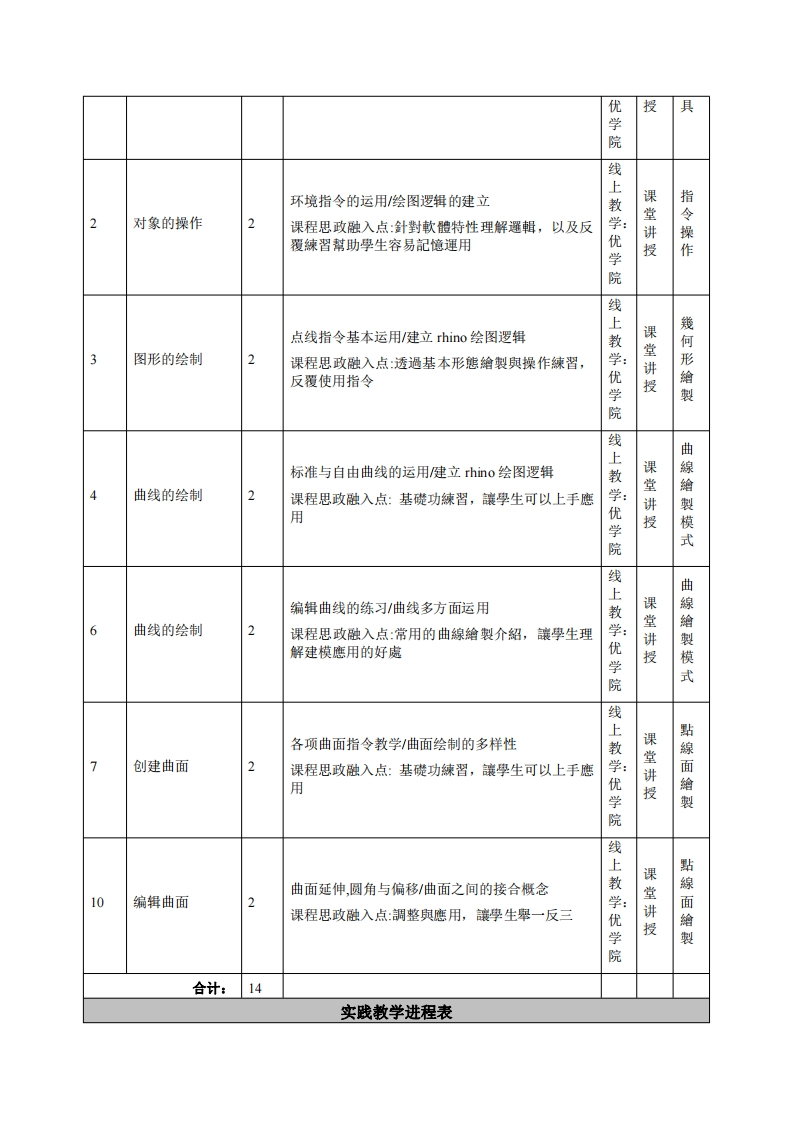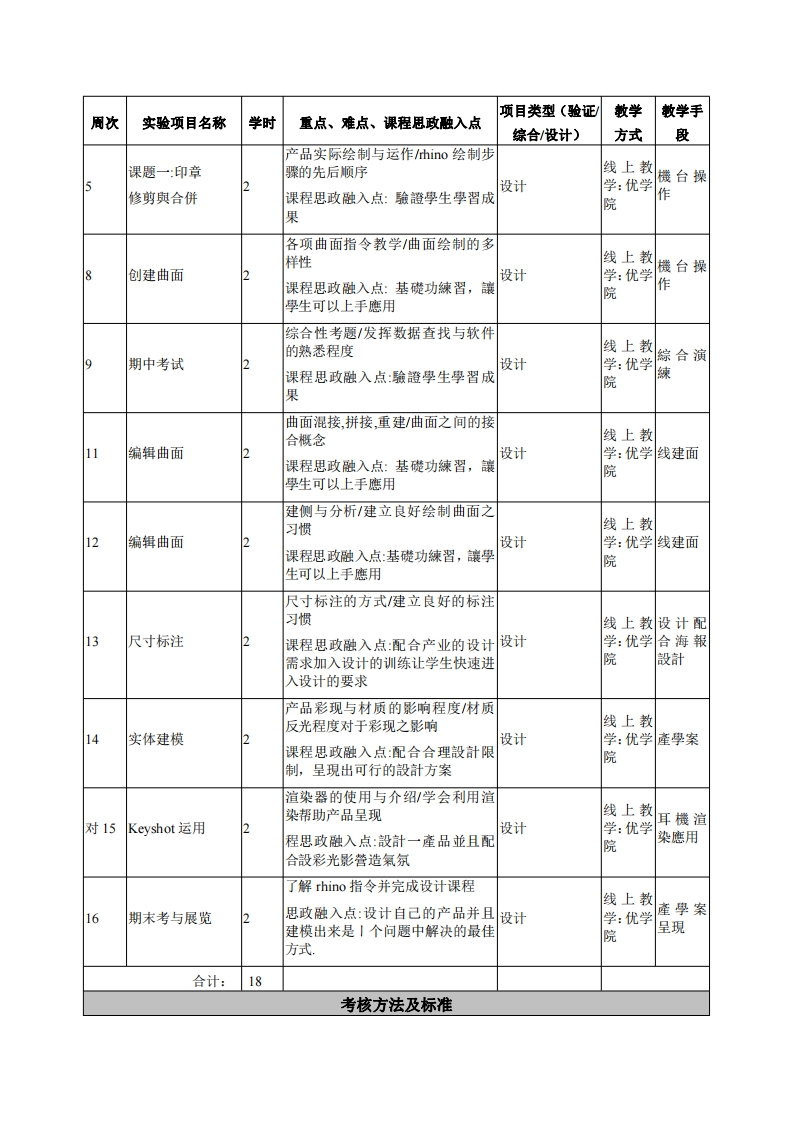 《计算器辅助工业设计》教学大纲课程名称:计算器辅助工业设计课程类别(必修选修):必修课程英文名称:Computer Aided Industrial Design总学时/周学时/学分:32/2/2其中实验/实践学时:18先修课程:授课时间:授课地点:实验楼503机房授课对象:2019工业设计1班开课学院:粤台产业科技学院工业设计系任课教师姓名/职称:张鸿食答疑时间、地点与方式:课程考核方式:开卷()闭卷()课程论文()其它(V计算机上机考)使用教材:1.Rhio5.0完全实战技术手册/张雨滋清华大学出版社/出版时间:2016年07月2.一条线建模rhino产品造型进阶教程/人民邮电出版社/2018/9月出版教学参考资料:Rhio5.0完全自学教程(第2版)y徐平/章勇/苏浪2014-06-01/人民邮电出版社.2.Rhino三维建棋实例教程/张釜/化学工业出版社课程简介:本课程以学习3D建模软件Rhio为主要内容,让学生了解建模时的概念与执行步骤,为未来进入设计产业做准备。课程救学目标本课程与学生核心能力培养之间A理解一建模步骤与概念之建立的关联(授课对象为理工科专业B运用一独立完成产品建模学生的课程填写此栏):C运用一建模彩现之呈现■核心能力1.一、知识目标:■核心能力2.1.掌握计算机绘图的橛念、技法、逻辑、结构及重要性;■核心能力3.2.计算机绘图的交叉应用方式,渲染与建模,两种建模软件互口核心能力4.用。口核心能力5.二、能力目标:口核心能力6.1.熟练掌握rhino的建棋概念,并且能够独立思考与解题;口核心能力7.2.绘制建模正确的理解与绘制上的速度。口核心能力8.三、素质目标:1.培养学生具有主动练习、持之以恒、认知建棋应用的真实想法、探究设计态度和意识;理论教学进程表学时周次散学主题教学的重点、难点、课程思政融入点教学教半作业数方式手段安排环境与工具之鹰用/hino的操作环境线Rhino基本操作课程思政融入点:反复理解绘图步骤,让学生利用重上课堂記复的方式记忆建模的逻辑教学:讲工