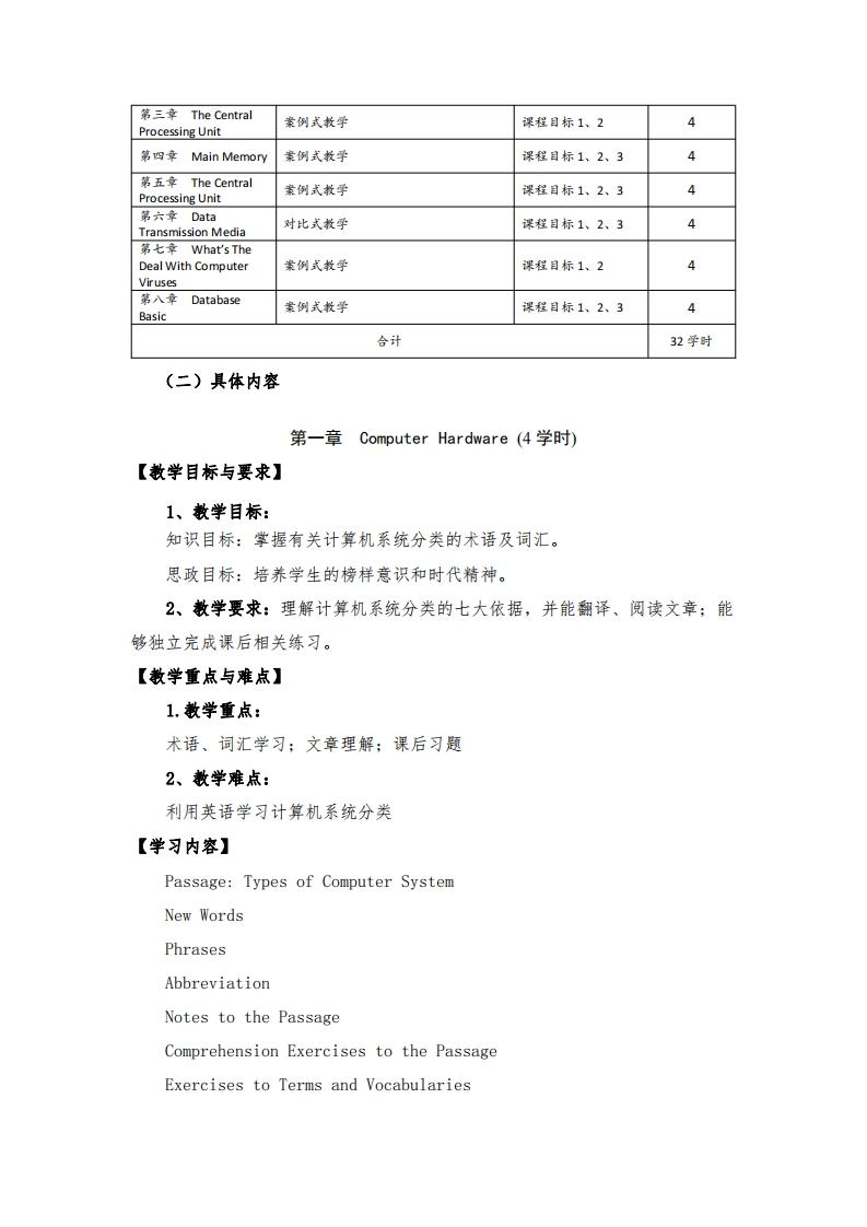《计算机专业英语》课程教学大纲一、课程信息课程名称:计算机专业英语Specialized English for Computer课程代码:06E4124B课程类别:专业核心课/必修课适用专业:计算机科学与技术课程学时:32学时课程学分:2学分修读学期:第一学期先修课程:大学英语、计算机导论二、课程目标《计算机专业英语》是计算机科学与技术专业的核心课程之一,是理论性、应用性很强的一门必修课。通过本课程的教学,使学生掌握计算机专业方面的英语词汇,培养学生阅读和理解计算机外文文献的能力,进而具备识别和洞察计算机领域知识发展和新研究方向的能力,认识到自主学习和终身学习的必要性,学生学习计算机前沿知识,实现与世界接轨。本课程主要包括计算机硬件、计算机系统、网络及数据传输等内容,讲授计算机领域相关的专业术语、翻译技巧及专业表达方式。(一)具体目标通过本课程的学习,使学生达到以下目标:1.在熟练运用计算机领域相关的专业术语、句型和常用词组的基础上,通过国内外文献研究,调研和分析计算机工程问题的解决方案。【支撑毕业要求指标点4.1】2.能够应用英语进行口头、书面表达等,准确表达计算机专业问题,理解与业界同行和社会公众交流的差异性,具备与业界同行和社会公众应用英语沟通和交流的能力。【支撑毕业要求指标点10.1、10.2、10.3】3.能够应用英语很好地理解、识别和洞察计算机领域知识发展和新研究方