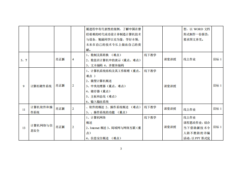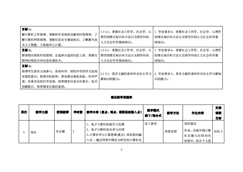 《计算机基础与计算思维》教学大纲课避名称,计算机基础与计算思维课忍类别(必修选修)必修课程英文名称:Fundamentals of Computer and Computational thinking总学时周学时学分:32/22.0其中实检实液学时,16先继课是:无后续课震支嫌文字处理、图像处理、EXCEL数据分析、数据库、python语言程序设计等授课时间:第3-18周34节授课地点:实验楼314课对律:24级多媒1班、2024级工业设计开裸学陕:粤台产业科技学院任课就师姓名称:肖正新(讲师)答时间、地点与方式:1课前和课后,一对一问答答疑:2.课后采用微信或QQ答凝:3.课堂上针对共性问愿进行统一答疑。课程考核方式:开卷()闭卷(√)课程论文()其它()使用微村,《计算机基础与计算机思维》儒福松黄蔚、张志强清华大学出版社《大学信息技术基础项目化教程实训指导》赵军,薛亮上海交通大学出版社微学考查料:《大学计算机基础计算与信息素养(第2版)》战德臣聂兰顺张丽杰高等教育出版社2018版《大学计算机基础》李风霞等高等教育出版社《计算机应用基础一计算与计算思维》侯家利、吴燕玲、徐建敏西安:西安交通大学出版社,2018裸避物介,本课程主要讲授计算机基础知识,包括计算机操作系统基本原理及其使用、常用的应用软件、网络原理及基础知识、大数据、人工智能、云计算、物联网等内容。本课程从内容上嵌入计算机思锥能力培养,并兼顾应用型学习者的需求,在实践内容上设计相应的信息工具的使用,在理论上理解计算科学与计算机科学的基本概念和原理。课程放学目标及对华业要求指标点的文排课老妆学耳标支撑毕业要求湘标点单业要求