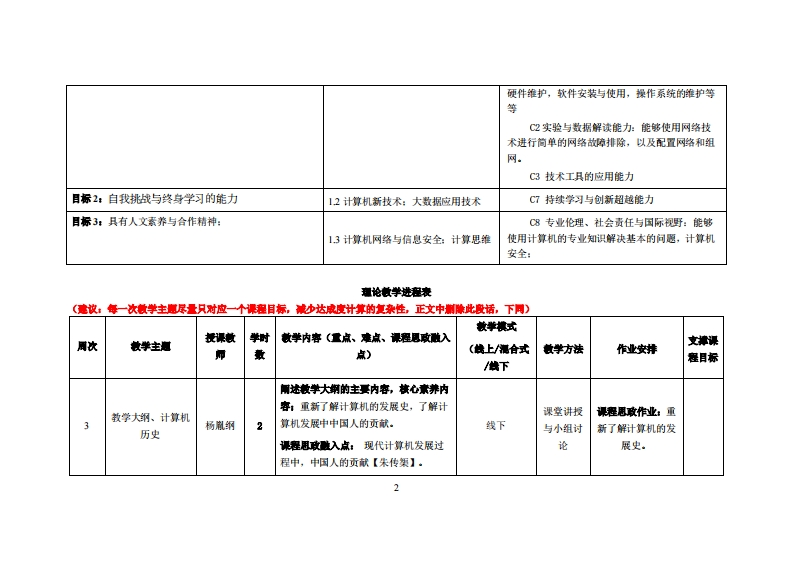 《计算机基础与计算思维》教学大纲课避名称,计算机基础与计算思维课和类别(必修选修):必修课程英文名称:总学时周学时学分,322/2其中实检实液学时,16先修课塞:后续课程支推授课时间:318周,周一1、2节,周四3、4节:授课地点:实验楼206提课对津:2024电商1、2雍,金散1、2奕开裸学陕:粤台科技产业学院任课就师姓名称:扬加铜/红程师答展时间、地点与方式:实整楼206,撒信群课程考核方式:开卷()闭卷(√)课程论文()其它()使用微材:《计算机著瑞与计算思维》棉酒松(第二版)课程情介:课程情介:计算机基础与计算思维是为喜台全宽新生开设第一门计算机必修课课程。内容湾及计算机各顺城震老和知识县面的内容和大擎生必不可少的应用技施。包括了计算机盖磁知识、兼据的进制、操作系镜盖地知识、办公处理款件、Int阳t、局网、兼据序盖墙、计算机信惠安坐、程序设计盖随等方面的内客,通过本课程的妆学,不仅让学生掌强了计算机的蒸暗知识,而且初步具有利用计算机分析问题、解决问题的意识与能力,提高了学生的计算机素网,为将来应用计算凯知识和技能解决自己专业实标向愿打下著璃。课避被学目标及对毕业要求指标点的支排:课程妆学目标支撑单业2要求指标点单业要求目标1:专业基础知识与独立思考的能力L.1计算机组成与工作原理:计算机软C1独立思考与交叉知识的运用能力:具备件与信息表示:计算机网路:计算机程从事任何行业所具备的计算机基础能力,能够独序设计立解决计算机领域所遇到的基础问题的能力,如