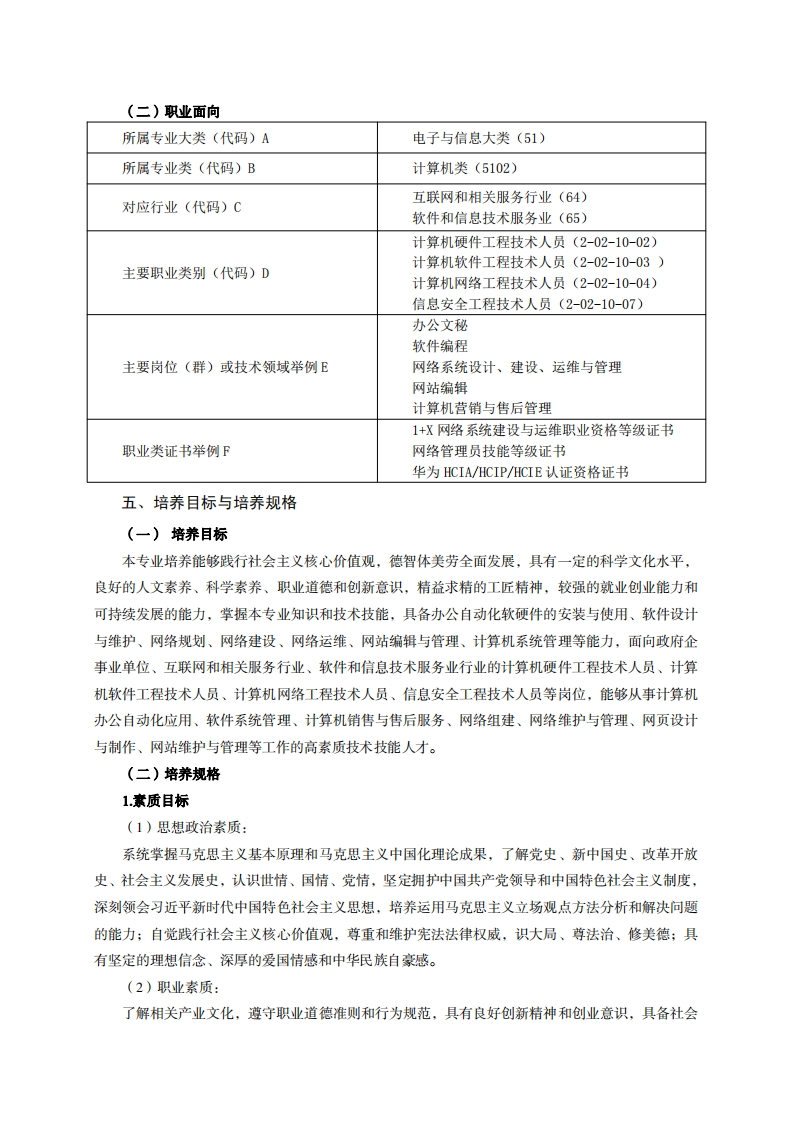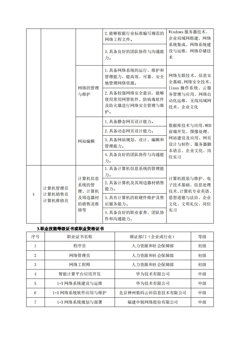 《计算机应用技术》专业人才培养方案一、专业名称及代码专业名称:计算机应用技术专业代码:510201二、入学要求招生对象:高中(中职)毕业生或具有同等学力者。招生类型:文理兼收。三、修业年限三年。四、职业面向(一)职业能力分析1.专业服务面向本专业面向政府企事业单位、各类计算机企业、各类互联网公司,主要从事信息化系统管理、软件系统设计与开发、网络组建、网络维护、网络管理、网站建设、网站管理等工作,也可以从事计算机相关产品的售前售后服务与生产等相关工作。2.职业岗位与职业能力分析序号工作岗位典型工作任职业能力支撑课程务1.能够熟练安装和使用PS1.公文的编Office等办公软件,具备文档的辑和处理录入、编辑技能。信息处理技术、计算机2.常用办公应用综合实训、图像处1办公室文员设备和办公2.能够熟练使用和维护打印机、软件的安音视频设备、传真机、投影仪等理、写作与沟通、思想常用的办公设备。道德与法治、企业文化装、使用和维护3.具备良好的团队协作与沟通能力。1.具备简单程序设计与编辑能力。C语言程序设计、服务21.程序设计程序员2.具备常用软件系统维护能力。器脚本语言、Python程2.软件维护3.具备良好的团队协作与沟通能序设计、企业文化力。网络工程师1.网络规划1.具备网络系统的规划、设计和计算机网络基础、综合网络管理员2.网络施工网络设备的软硬件安装、调试与布线技术、网络互联技网站编辑员3.网络运维升级等能力。术、linux操作系统、