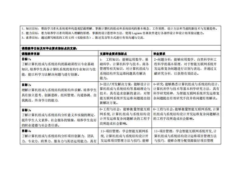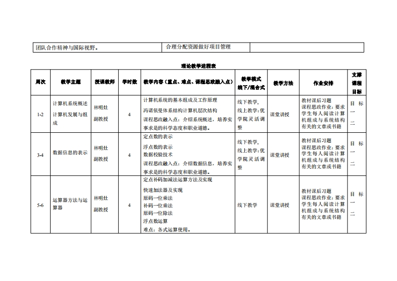 《计算机组成与系统结构》教学大纲课容名称:计算机组成与系统结构课程类别(必修选修)事必修课程英文名称:Computer Or孕nization and Architecture总学时周学时/学分,48/3/3其中实险实我学时:16先课是:数字理舞、程序设计1、大学计算机基础与计算思维后续课程支撑:传感悬与检测技术授课时间:1至16周里期二57节授课地点:莞城6405提课对津:2024鞭计算机科学与技术诗续电商)电商1-2班粤台)开课学洗:粤台产业科技学陕任课敏即姓名/职淋:林明灶/测做授容疑时间、地点与方式:1每次课的课前、课间和课后,采用一对一的问答方式2每次习题课,采用集中讲解方式.课程考核方式:开卷(√)闭卷()课程论文〔)其它(√)使用微材:《计算凯组成厚理(徽课版》,潭志虎.第2版人民邮电出版社,1SBN9787115660626枚学◆考度料:L.南京信息工程大学_中国大学MO0C幕课)https://www..icoursel63.orgcourse/NUIST-l461671161tid=l467127614资源共享课网站.2.计算机组成原理华中科技大学秦磊华中国大学MOOC(幕课)htps:www.icoursel63.org/course/HUST-l003159001课程情介:本课程介绍计算机单处理机系统的组成和工作原理,在此基础上扩展讲授并行体系结构。内容共分()计算机系统及其性能评价进行概述性介绍,②)数据的机器级表示、(3)运算以及运算部件的结构与设计,(4)主要介绍包含主存、ce和虚拟存储器在内的原理及其存储器分层体系结构,(5)指令集体系结构,(⑤微过程控制器、流水线技术、单核CPU的多线程、多核CPU、多处理器等CPU设计技术,7)总线互连以及(⑧)章输入输出系统。1、贯彻课程目标: