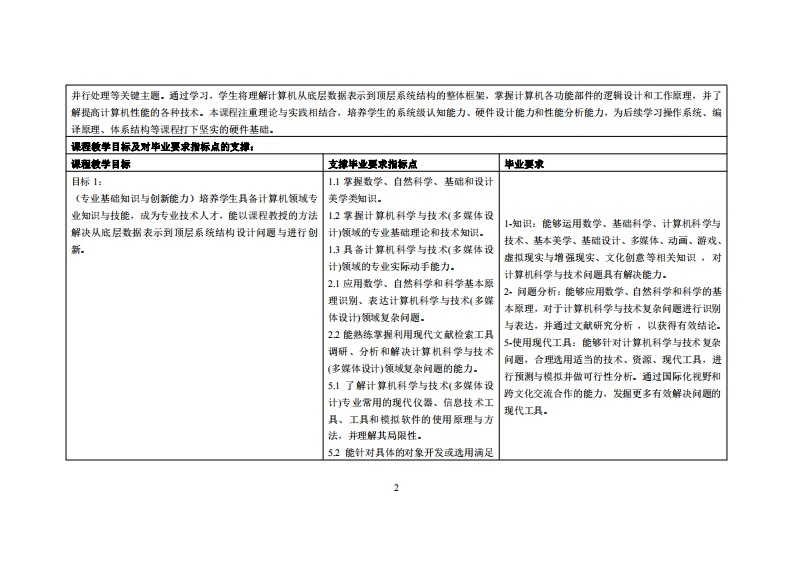 《计算机组成与系统结构》教学大纲裸程名称:计算机组成与系统结构课程类别(必修选修)事必修课程英文名称:ComputerComposition and SystemArchitecture总学时周学时/学分,483/3其中实险实戒学时:0先集课是:程序设计【、程序设计山后续课程支撑:项目化课程5、专业实习授课时间:217周星期三1-3节授课地点:605机原提课对津:2023多媒体系1班开课学洗:粤台产业科技学院多媒体设计系任课敏即姓名/职淋:盛介中/副教授容疑时间、地点与方式:实验楼3071每次课的课前、课间和课后,采用一对一的问答方式:2每次习题课,采用集中讲解方式课程考核方式:开卷()闭卷(√)课程论文()其它()使用微材:计算机组成原理与系统结构(第3版),冯建文、章复嘉、赵建勇、包健,高等教育出版社。收学◆考资料:1.《计算机系统结构(算4版)》·张晨难等:高等数有出版社·2.《计算机姐成原理实用程(第3版)》·王万生零清中大学出版牡·课程信介:《计算机组成原理与系统结构》是计算机科学与技术及相关专业的核心基础课程。本课程台在系统闸述计算机硬件系统的组成原理、内部工作机制以及系统结构方面的基本概念和设计方法。课程内容涵盖数据表示、运算器设计、存储系统、指令系统、中央处理器(CPU)设计、输入输出系统以及
