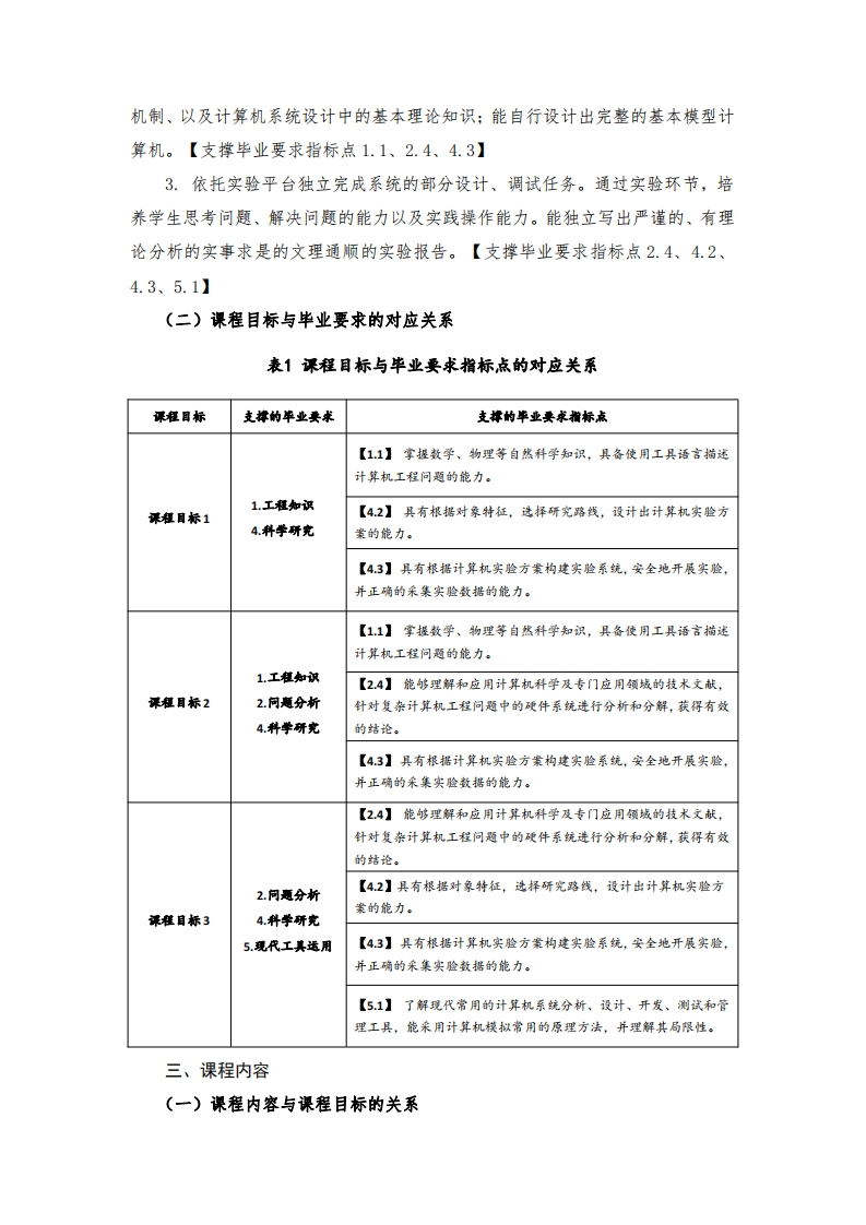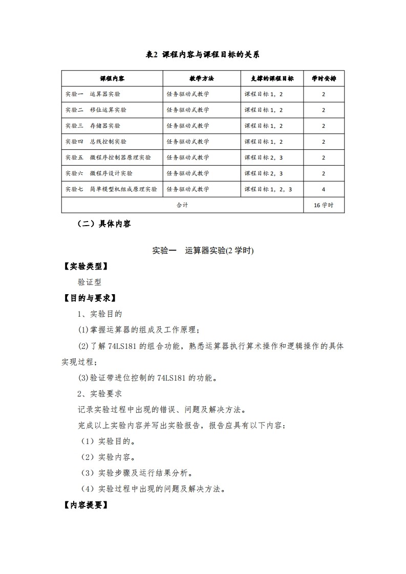 《计算机组成与结构实验》课程教学大纲一、课程信息课程名称:计算机组成与结构实验Experiment of Computer Organization and Architecture课程代码:06E4117B课程类别:专业必修课适用专业:计算机科学与技术专业课程学时:16学时课程学分:0.5学分修读学期:第四学期先修课程:数字电子技术、电路与电子技术二、课程目标《计算机组成与结构实验》课程是计算机类专业的一门专业核心必修课,是为配合《计算机组成与结构》课程的教学而开设的独立实验课程。通过实验加深学生对所学知识的理解,掌握其硬件系统中运算器、控制器、存储器、输入设备和输出设备的实现方法。培养学生分析和设计计算机各部件的能力,特别是动手能力,使学生做到理论与实践相结合、硬件与软件相结合,逐步达到能运用理论知识设计一些性能良好的指令系统,提高自行设计、调试、分析问题和解决问题的能力。本实验课要求学生掌握计算机基本部件的基本结构和工作原理:能够独立利用所学的知识并依靠实验平台完成实验:使学生对计算机基本部件的工作原理和工作过程的理解和设计硬件的能力得到进一步提高。(一)具体目标通过本课程的学习,使学生达到以下目标:1.通过实验教学配合理论教学,要求学生较全面的了解计算机系统中硬件系统的组成:掌握计算机硬件系统中各大部件的功能、组成原理及工作原理。【支撑毕业要求指标点1.1、4.2、4.3】2.通过实验教学,要求学生理解完备的计算机的基本组成原理与内部运行