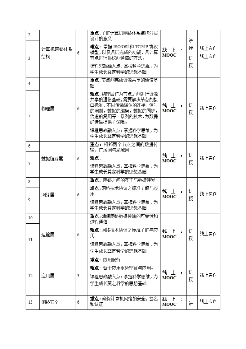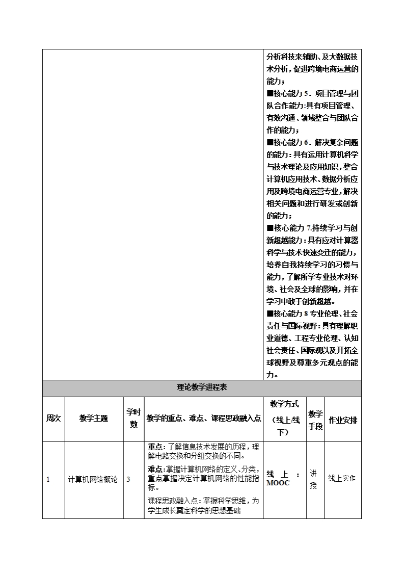 《计算机网络与通讯》教学大纲课程名称:计算机网路与通讯课程类别(必修选修):必侈课程英文名称:Computer network and communication总学时周学时学分:48/33其中实验实践学时:6先侈课程:授课时间:星期2(1-3节)授课地点:实验搂605授课对像:18级计算机科学与技术系(电商专业开课学院:皂台产业科技学院任课教师姓名职称:詹家榜/副授答疑时间、地点与方式:课程考核方式:开卷()闭卷(0)课程论文《)其它《)使用散材:计算机网路:自顶向下方法(原书第6版)James F.Kurose;:Keith W.Ross机械江业出版社教学参考资料:课程简介:《计算机网络与应用沁以计算机网路体系结构的层次模型为主线,通过格层次功能的理论与实现,让学生了解和掌握计算机网路的基本原理和工作过程,同时通过丰富的实验案列饼解和分析,培养学生掌握计算机网路的原理、配置和安全控制等,具备分折网路和故障查的能力课程教学日标本课程与学生核心能力培养一、知识目标:之间的关联授课对象为理工1.了解信息技术发展的历程,理解电路交换和分组交换的不同,科专业学生的课程填写此栏):掌握计算机网路的定义、分类,重点掌握求症计算机网路的性能指赤;■核心能力1交叉知识的运2.引导学姓对了解计算机网路体系结构分层设计的意义,掌握用能力:具有运数学、基础IS0/OSI和TCPP协议模型,以及各层完成的功能,各计算节点进科学及计算机科学与技术相行协议间通信的方式,深入学习相联理论及应用灯下的基础。关知识的能动;二、能动目标:口核心能力2实验与数据解1.理解计算机型路的物理层、数据链路层、路层、运输层、应读能动:具有计算机软件开发用层的有关基本疑念和基本原理。了解相应的有关新被术和防法;与数据搜气分折解释的能力;2.通过课程的学习,使学生对网路的了解,对于路安全与应用口核心能力3技术工具的应有一定的了解。用能力:具有计算器软件工程三、素质目标:技术应用、数据搜集纷折应用1.培养学姓具有主动修与、积极进取、崇尚科学、探究科学的学跨境电商运营知识与被能、及习态度和思想意识;大数据技术的专业所需的技2.养成理论联系实际、科学严谨、认真细政、实事求是的科学态术、技能和使用软硬件辅助工度和吧业道德。具的能动;口核心能力4.计科与大数据分折专业能力:具有编程设计能力并能应用计算器与数据
