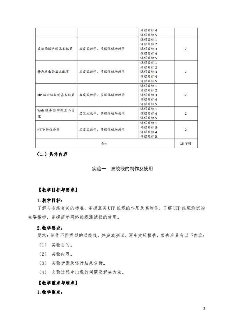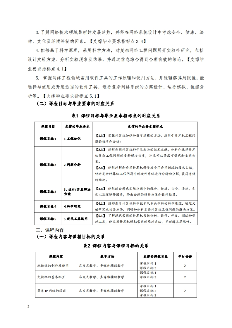 《计算机网络原理实验》教学大纲一、课程基本信息课程名称:计算机网络原理实验Experiment of Computer Network Principle课程代码:06E4119B课程类别:专业核心课适用专业:计算机科学与技术课程学时:16学时课程学分:0.5修读学期:第4学期先修课程:计算机导论、数字电子技术二、实验课程的性质、地位与任务《计算机网络原理实验》是计算机科学与技术专业的一门专业核心课,是为配合《计算机网络原理》课程的教学而开设的独立实验课程。通过本课程的教学使学生在掌握计算机网络基本理论知识和主流网络技术的基础上,掌握网络协议的基本结构;熟悉各种网络及其对应的协议;学会网络协议的基本分析方法;能够独立设计实验方案并依靠实验平台完成系统的调试:使学生对典型计算机网络的分析、设计、配置与使用能力得到训练与提高,为学生后续从事计算机网络应用、设计与开发和进一步的专业学习打下必要的实践基础。《计算机网络原理实验》主要包括五个课程目标。(一)具体目标通过本课程的学习,使学生达到以下目标:1.掌握网络的基本原理,能够从层次的角度理解网络的基本体系结构,能够描述每一层的基本功能,代表性协议等相关知识,能应用于复杂网络系统的规划与设计、系统集成、管理维护以及安全保障等。【支撑毕业要求指标点1.3】2.能根据所学基本原理,构建分析筒单位的网络拓扑,并通过查找文献,进行方案的比较与选择。【支撑毕业要求指标点2.2】