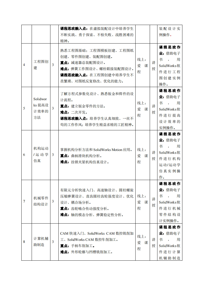 《计算机辅助机械制图2》教学大纲课程名称:计算机辅助机城制图2课程类别(必修选修):选修课程英文名称:Computer-Aided Mechanical Drawing2总学时周学时学分:48/3/3其中实验/实践学时:24先修课程:大学计算机基础、计算机辅助机械制图1授课时间:1-16周授课地点:网上;粤台产业科技学院授课对象:2018自动化1班开课学院:粤台产业科技学院任课教师姓名职称:谭华讲师答疑时间、地点与方式:1.线上:课间、网上、网络交流;2.线下:课前课间课后、教室、面授。课程考核方式:开卷()闭卷()课程论文()其它(√)上机使用教材:爱课程资源https::/www.icourse163.org/course//NWPU-1207040802,《Solidworks.三维产品设计与建模》教学参考资料:1.《SolidWorks2018三维设计及应用教程》,商跃进,机械工业出版社;2.各精品资源共享课网站。课程简介:Solidworks是自动化学科一门实操性较强的专业课程。本课程系统地介绍了计算机三维辅助设计的基本原理及实现方法。通过设计案例,以SolidWorks及其插件为平台,详细介绍了使用现代工具进行零件建模、虚拟装配、图纸绘制及产品展示等CAD技术,进行运动仿真和FEM分析的CAE技术以及进行数控铣削和车削编程的CAM技术。讲授本课程的主要任务是使学生具有计算机辅助设计的基础知识,训练学生运用计算机进行设计的基本技能,帮助学生认识计算机辅助设计知识点产生的背景及应用领域,课堂采用线上、线下、网络、面授多元化散学模式,破除填鸭式弊端,提高专业课教学质量,为东莞理工学院坚持社会主义办学方向、培养德才兼备全面发展人才尽绵薄之力。课程教学目标本课程与学生核心能力培养一、知识目标:之间的关联(授课对象为理1.掌握草图、零件图、装配图和工程图的绘制:工科专业学生的课程填写此2.熟悉零件参数化设计、虚拟装配设计及国标图纸创建等核心操栏):作方法,并制定相应的考核评价标准。☑核心能力1.应用数学、基二、能力目标:础科学和工业工程专业知识1.运用空间思维和分析问思的能力设计零件图和装配图:的能力:2.学会独自分析3D图纸的能力,举一反三,综合所学知识进行开口核心能力2.设计与执行实发设计中的初步创新。验,以及分析与解释数据的三、素质目标:能力;1.培养学生具有主动参与设计、积极进取学习、巢尚科学知识、☑核心能力3.应用工业工探究科学真理的学习态度和思想意识;程领域所需技能、技术以及2.养成理论联系实际、科学严谨、认真细致、实事求是的科学态款硬件工具的能力;度和职业道德,引导学生重视人性化的计算机辅助设计对经济、环保口核心能力4.对生产系统进及人文关怀的重要作用,使得学生深刻理解、并认知到学习工作中努行规划、建棋、改普、评价力做到优化设计的社会责任感。的能力: