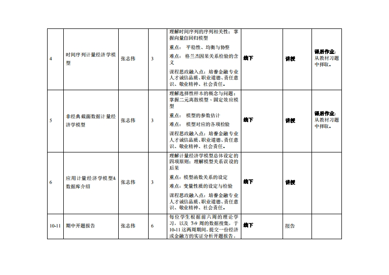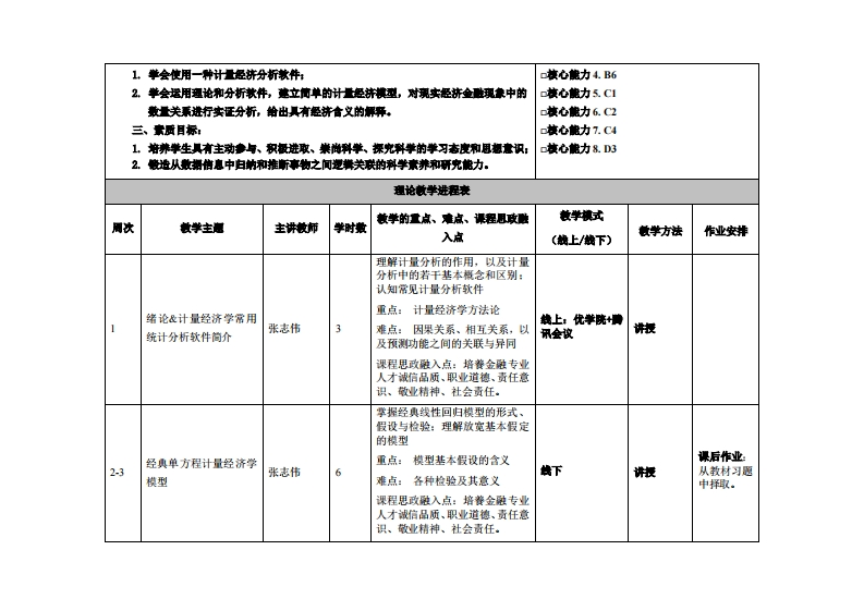 《计量经济学》教学大纲课程名称:计经济弹课程类别(必修进修):选修课程英文名林:Eco阳ometrics总学时周学时学分:48/33其中实验实藏学时:16先修课是:现经济学、安现经济学、线性代业、振率论与意速统计授课时间:每周三57节14:30-17:10)提裸地点,616机房提课对橡:20绿金融2斑开裸学愧:事合产业科技学洗任课敏师姓名职称:张志怖/妆授答凝时何、地点与方式:栋合实险大楼208课程特核方式:开港()闭卷()课程论文()其它()使用做村:李子来,滑文卿:《计量经济学)高等就有出版社做学事考责料:陈温:《高饭计量经济学及Saa应用(第2版)》易丹海:《兼据分析与Eviews应用》张文形:《SPSS统计分析盖德妆程》胡流冬、董辰辉年《Maab从入门到精通)兼、陈立普:《仅语言实用批课淀简介:计量经济学是以经济惠论为州导,以数据事实为依据,以数学、统计学为方法,以计量分析款件为工具,研究经济关系和经济活动量量州律及其应用,并以意立计量经济慎型为核心的一门经济学学料,其根本任务是估计经济模型和检险经济慎型。课程妆苹目标本课容与苹生技心能力培养之间的关联授漂一、知识目标:对康为理工科专业举生的课程填写此栏):上。了解计量轻济举作为一门独立学科的主要思想和爪速:核心能力1.Ad2。掌基本的经典计量经济学理论与方法。c核心能力2.B2二、能力目标:被心能力3.B4
