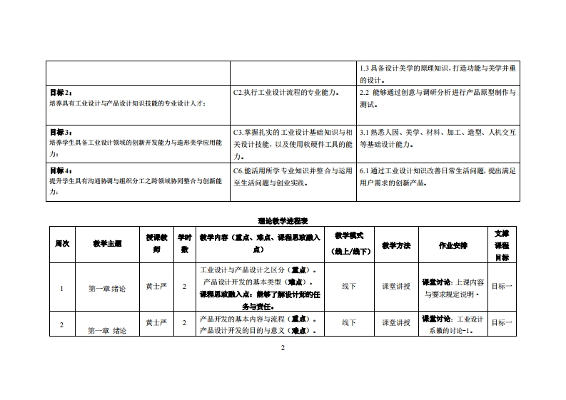 《设计实务讲座》教学大纲课和名将:设计实务讲座裸类别(必修选修):专业透体课渠程英文名称:Lectures of Design Practice总学时周学时学分:32/22其中实验实艘学时:0先修课是:无后续课短支排:毕业设计授课时间:两三1-2节1-16厕授课地点:实218授课对律:2021额工业设计开课学陕:粤合产业科拉学洗任课做姓名职称:黄士严妆证答疑时间、地点与方式,实202周二塘34节课程考被方式:开港()闭卷()课程论文()其它()使用微材:《现代产品设计开发》,金海着,机械工业出版社,2023年08月1SBN:787111722038数学争考资料:《设计思维与创意》作清:伍常着,北京大学出版壮,2007年09月1SBN:9787301127148课容情介:设计实务是盖于产品设计开发的基随理论,结合形式率省且卫动性夏的数字课程力求从实际需求出发,道过对各种前沿知识与产品设计实瘦热点案例的削析,对产品设计开发速程进行放进与优化,使其更符合21世纪企业党◆的需要,且便于个人和企业的操作使用。设计实务,可作为科研人员、产品设计人员及产品开发高是决策者的童考。课程数学目标及对华业2景求指标点的支排:课和做学目标支排单业要求指标点单业要求目标1:C1.熟练运用设计基础知识,智能制造1.2能够理解智能制造的基本概念和原理来实现设培养具有智能制速与产品设计相结合的智能化设计人才:知识与美学知识的能力。计的目标。