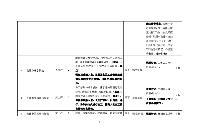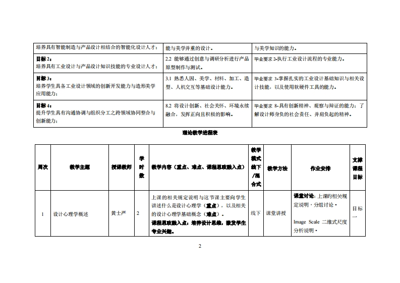 《设计心理学》教学大纲课避名称,设计心惠学课泡类别(必雀选修)·任修课程英文名称:Design Psycl山olo四总学时周学时学分,322/2其中实险实减学时,8先修课是:基本设计广品设计一】后续课程支撑:专测制作1授课时间:周三1-2节1-16周)餐地点:实验楼218机电楼310提课对津:2023饺工业设计开课学德粤合产业科妆学陕任课妆柳姓名淋:黄士严就授鞭时间、地点与方式:实202周二第1-2节08:30-10:10课避考核方式:开卷()闭卷()课程论文()其它()使用微村设计心题学(升级版)物沙着上海:上海人民美术出版社,2016.4艺术设计名家特色精品课程SBN:787-5322-7092妆学事考资料:国解投计心建学(全形升复版)(第二版)陈报化学工业出版社,2019-05-015BN:9787-1223-37436课难情介:设计心理举是一门设计艺术举与心理举交叉的新兴苹科,自21世纪开增伊始,便在国内广受关注,面又争议顺多。因为设计心理学的禁菜来自“需要”,一方面是设计学苹者和设计师提高设计学的速性与科举性的需要,另一方面来自大环续下对人性、人的本质需求,以及人们支善自身生存环境的需要。特助设计者更好地认识其设计目标人群设计相关的心理现◆和行为,起到成普和轴助设计的作用:同时增夏设计者对自身的思编过程和创造能力的了和以识,挺高其设计能力。课程妆学目标及对毕业要求州标点的支排:课应妆学目标支撑单业要求指标点华业要求目标1:13具备设计美学的原理知识,打造功毕业要求1熟练运用设计基础知识,智能制造知识
