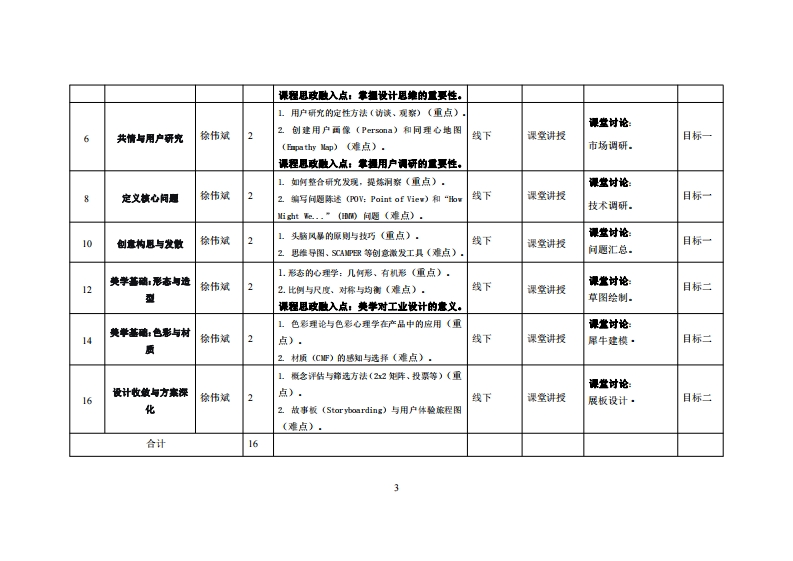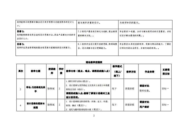 《设计思维与美学》教学大纲课程名称:331794设计愿维与美学课程类别(必修选修)事任造课程英文名称:Design thinking and Aesthetics总学时周学时/学分,32/2/2其中实险实驶学时:16先修课程:设计素描、机械制图与计算机轴助工业设计后续课程支撑:作品集设计、文化创意设计提课时间:周二3节(2-17周)提课地点:实218授课对律:2023级工业设计开课学晓:粤台产业科技学陕任课敏师姓名/职济:体伟城讲师答展时间、地点与方式:实218周二/5-6节课程考核方式:开卷()闭卷()课程论文()其它()使用被村:铁学考资料:《产品绿色设计),王立增等,西南师范大学出版牡,2020年12月1SBN:9787562192787课程黄介:本课程是工业设计专业的一门综合性理论实践课程。课程旨在系统讲授设计思维的核心流程、工具与方法论,并深入探讨美学原理、设计心理学及视觉语言在设计创新中的应用。学生将通过理论学习和项目实践,掌握从发现问题、定义问题到构思、原型制作及测试的完整设计流程,同时提升对形态、色彩、材质、工艺等美学要素的驾取能力,最终能够创速出兼具功能性、易用性、情感性与美感的工业产品设计方案。课程妆学目标及对毕业要求州标点的支撑:课程妆学目标(以《化苹反应工程》为例支律单业要求指标点毕业要求目标1:1.3具备设计美学的原理知识,打造功毕业要求1-熟练运用设计基础知识,智能制造知识