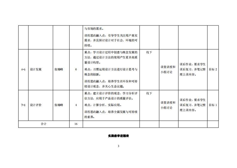 《设计方法》教学大纲课程名称:设计方法课程类别(必修选修),选修课程英文名称:Design Method总学时/周学时/学分,32/2/2其中实险实戒学时:16先能课是:设计振论后续课程支撑:寄领域设计产品投计与模型制作授课时间:周三34节(1-16周)提课地点:实218提课对津:2024工业设计1班粤开课学洗:粤台产业科技学陕任课师姓名只称:张瑞峰讲柳容鞭时间、地点与方式:周一至周五,实验楼307,讨论课程考核方式:开卷()闭卷()课程论文()其它()使用微材:产品设计方法学(产品设计第3版)/作者,王坤曾着,何人可偏/湖南大学出版杜/出版年2019/1SBN9787566717429妆学◆考资料:课程情介:《设计方法》这门课精由数导举生设计思健与设计方法的理论与应用,提升華生设计创断能力与视野,并且章想产品设计的流程。课程包音用户调研方法、用户需求分析、创意发晨、设计评估等环节。同时,将理论结合实囊,提升举生的设计能力及质量。在课程中,学生将学会运用多种设计方法,结合具体的设计案例进行实操训练,让举生学习以用户为中心的设计理老,掌复调研、数细分析等被术,更加准确的理解用户的需求,并且提升解决复来设计问题的能力。课程妆学目标及对毕业要求指标点的支排:课程妆学目标支撑毕业要求指标点单业要求