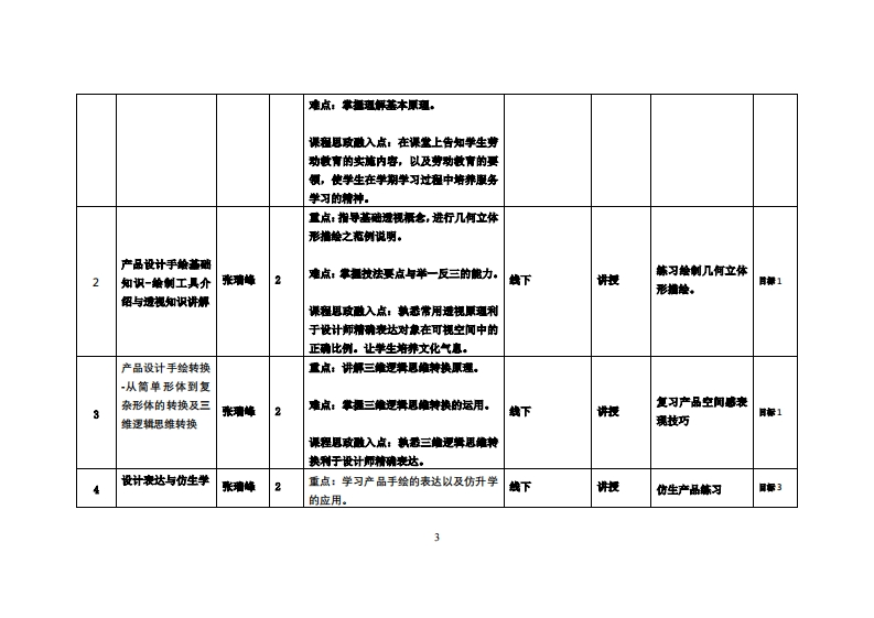 《设计素描》教学大纲课避名称,设计素播课和类别(必修/地修):选修课程英文名称:Des1 gn Sketch总学时/周学时/学分:32/2/2其中实险/实液学时,24先课程:项目化课程1、数字图律处理与兼宇绘后续课程支撑:3D数字维国、CD贴国维制授课时间:周三3-4节·2-17周授课地点:实206提课对津:2023计算机科学与技术专业(使媒体设计)(博台)开裸学陕:粤合产业荆妆学陕任课总柳姓名/巩称:张弹峰/讲师答展时间、地点与方式:周一至周五,实验楼213,讨论课程考核方式:开卷()闭港()课程论文()其它(√)使用微村:工业产品手维与创新设计表达/马赛/人民邮电出版社裸座简介:本课座是以设计餐老为主导的家推妆学形式,并着由单元主亮成各项送磁手绘练习、素指写生及创作,训练苹生爽察、中美、造型与瘦现等能力,特养羊生基本之素措放巧与设计方法。学习镇效薄由苹生习作,检技学生对设计盖础虎念的钠悉度与及素措放巧应用成果,并能更进一步能菇神于专业设计创作中。可时导入4江人工智能绘国的技法,引导学生方限更多元广门的专业能力。课程数学目标及对毕业要求指标点的支排:课应妆学日标支津单业要求指标点单业要球目标1:2.2能练掌漫利用现代文献检家工人2.间如分析,能够应用数学、自然料学和工程科学具有运用设计素撞进行产品盖储造型,通过分析与调研能调研、分析和解快计算机荆学与技术顺的盖本厚道,对于计算机科学与拉术复来间题进行力,将设计构思表达出来。城复来何惠的能力。